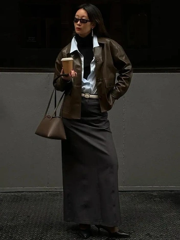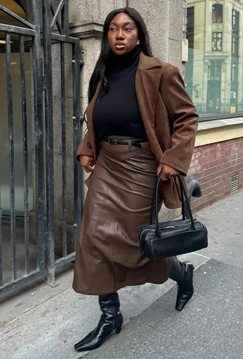 Водолазка + юбка-миди из кожи + высокие сапоги — бунтарство и французская утонченность в одном образе.