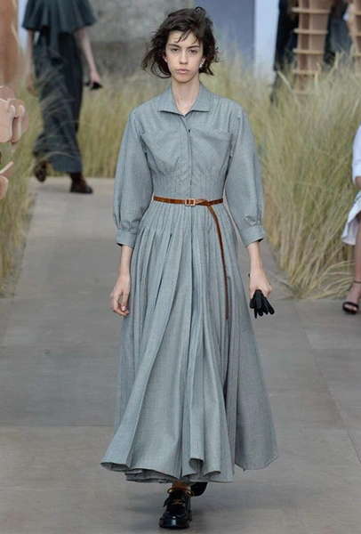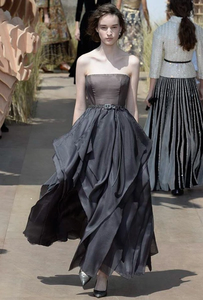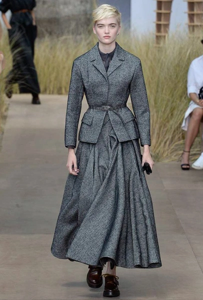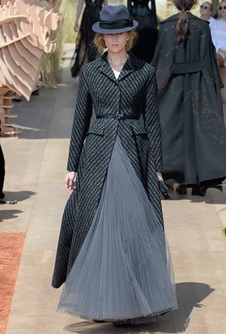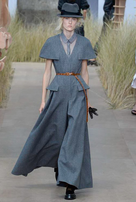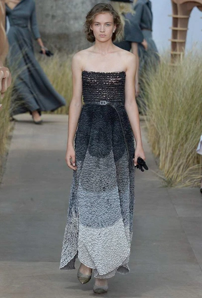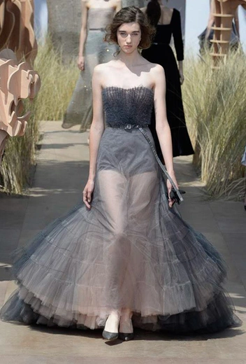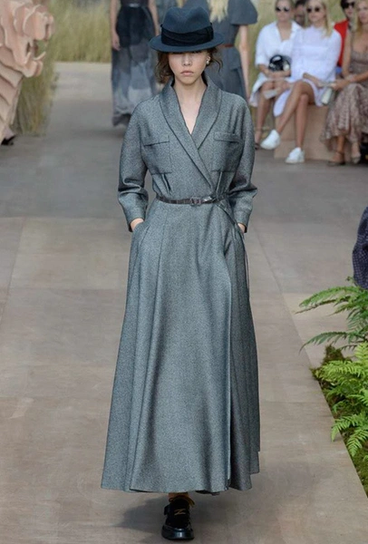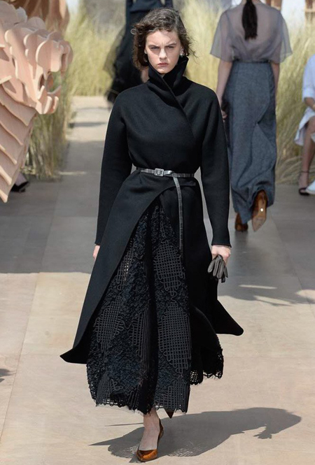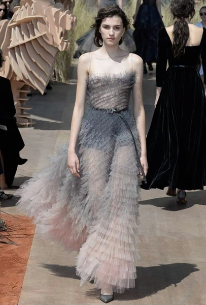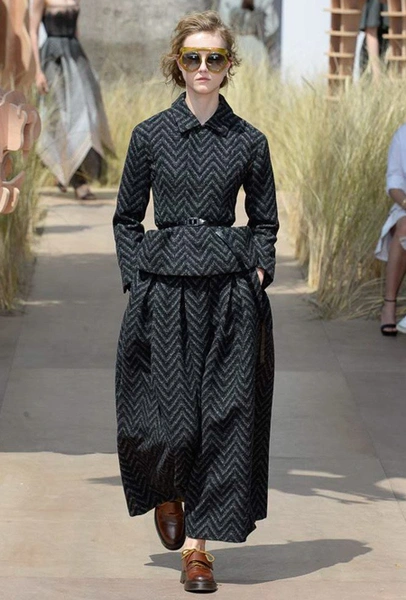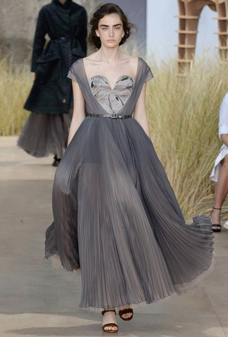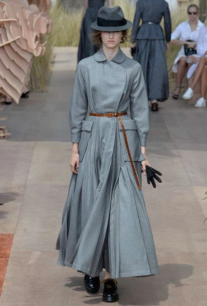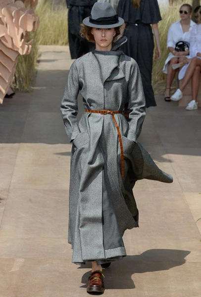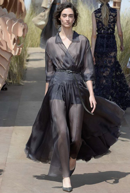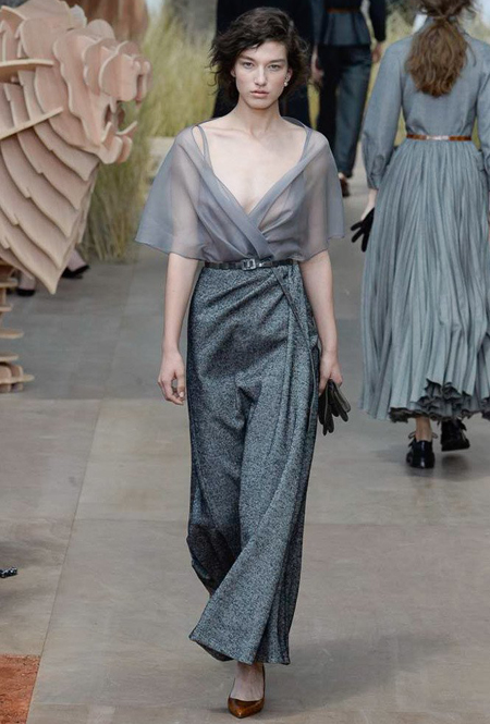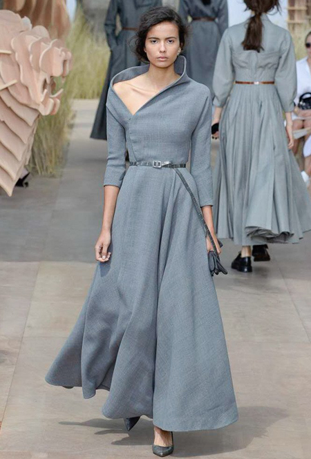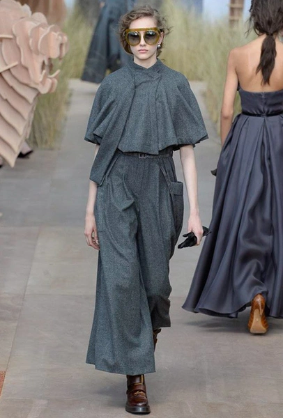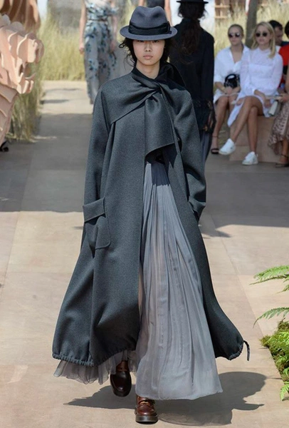 Началось шоу с оды всем оттенкам серого – от цвета мокрого асфальта до голубоватого оттенка дыма, стелящегося из печной трубы. Вещи из плотной шерсти и джерси – длинные платья и юбки, жакеты и пальто – напоминают дорожные костюмы, в которых путешествовали аристократки в XIX-м веке. Из серой ткани и невесомые полупрозрачные вечерние туалеты, их Кьюри приберегла для середины и финала показа. На них она демонстрирует все разнообразие приемов кроя и отделки – драпировки, кружево, плиссе, оборки, рюши, аппликации. Серый здесь часто уже не однородный, а в виде сложного деграде с переходами от светлого с темному.