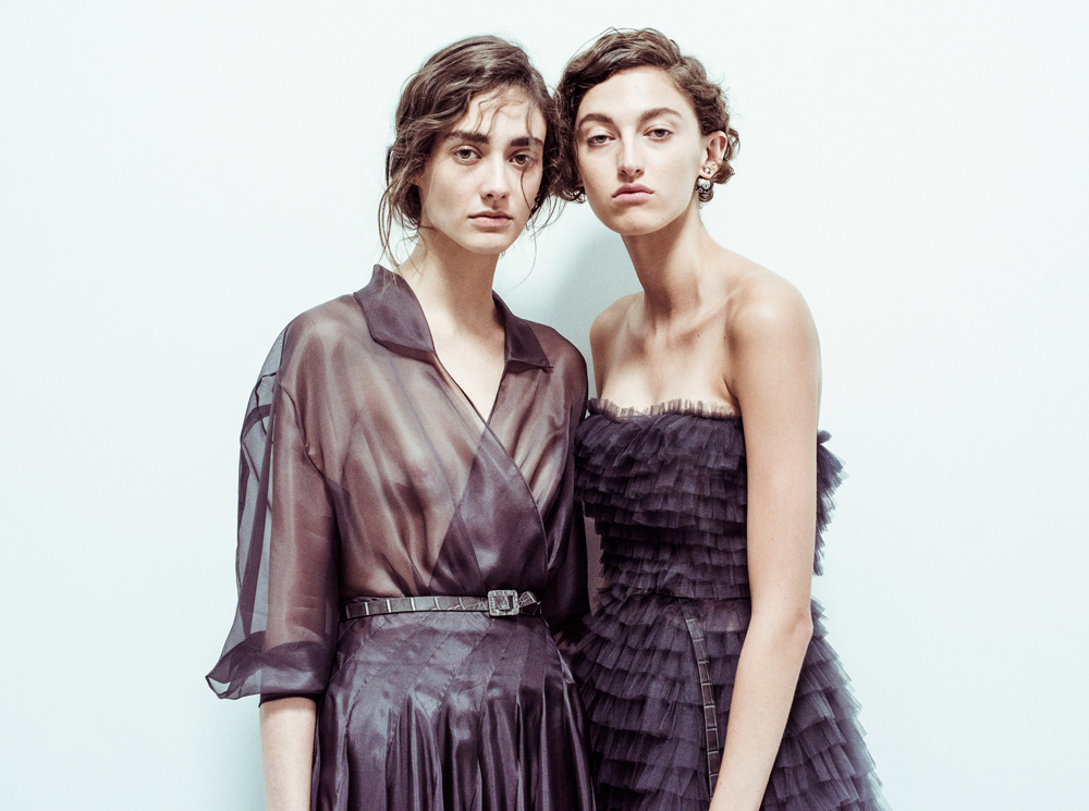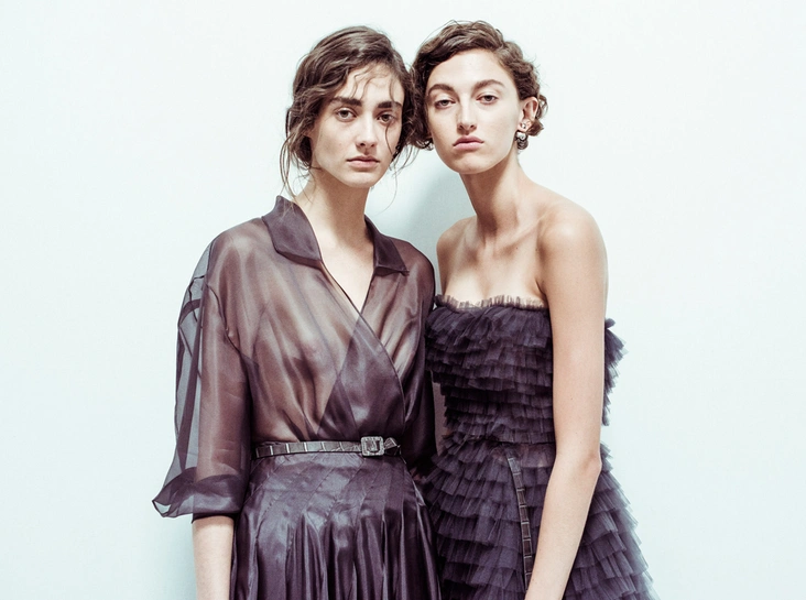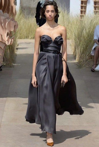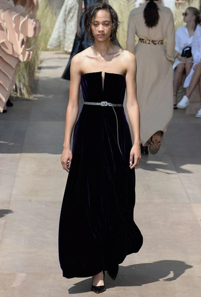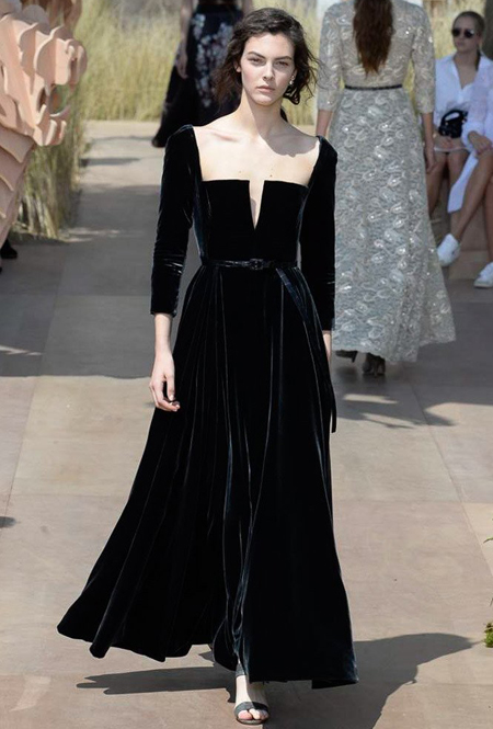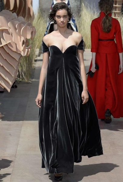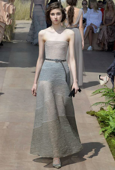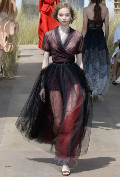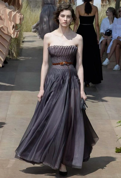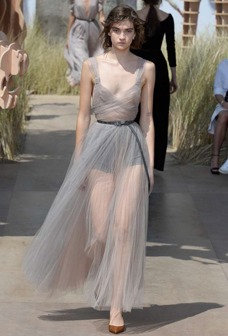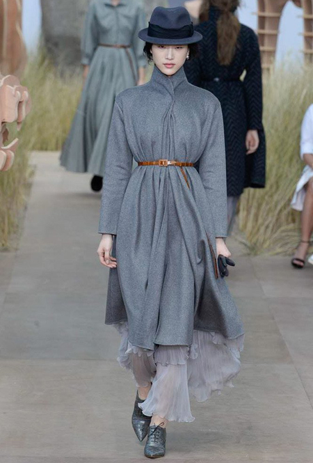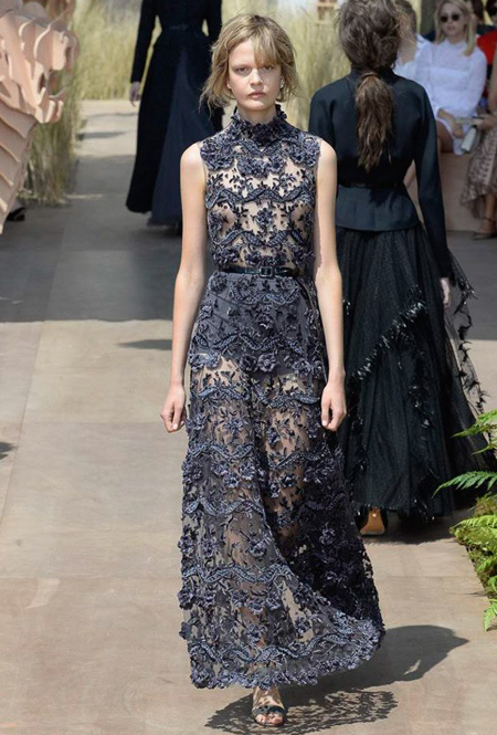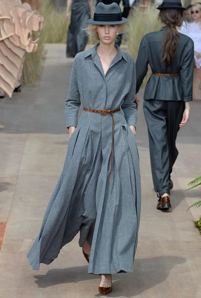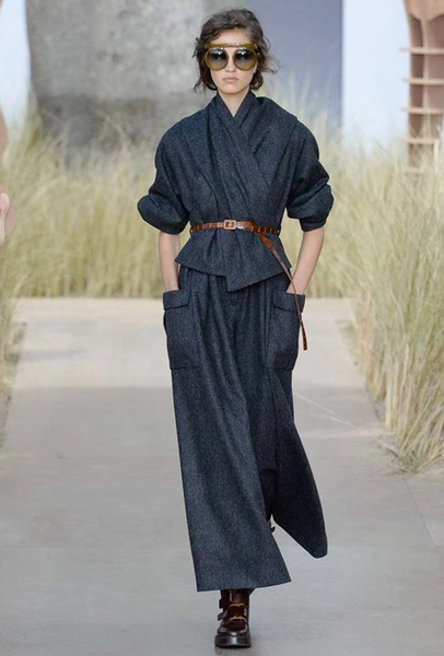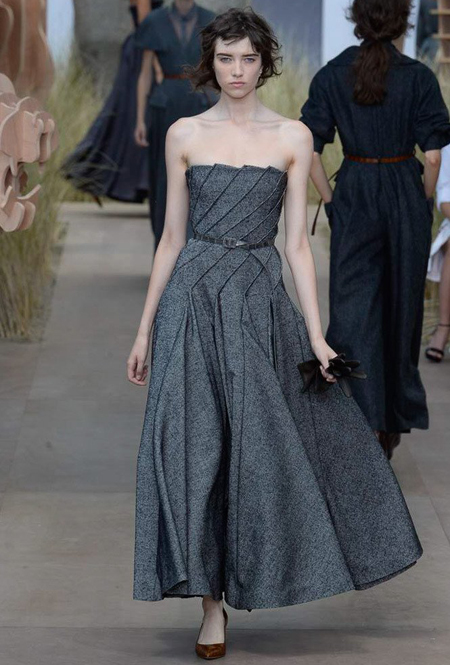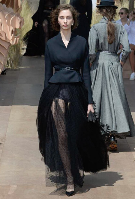 Началось шоу с оды всем оттенкам серого – от цвета мокрого асфальта до голубоватого оттенка дыма, стелящегося из печной трубы. Вещи из плотной шерсти и джерси – длинные платья и юбки, жакеты и пальто – напоминают дорожные костюмы, в которых путешествовали аристократки в XIX-м веке. Из серой ткани и невесомые полупрозрачные вечерние туалеты, их Кьюри приберегла для середины и финала показа. На них она демонстрирует все разнообразие приемов кроя и отделки – драпировки, кружево, плиссе, оборки, рюши, аппликации. Серый здесь часто уже не однородный, а в виде сложного деграде с переходами от светлого с темному.