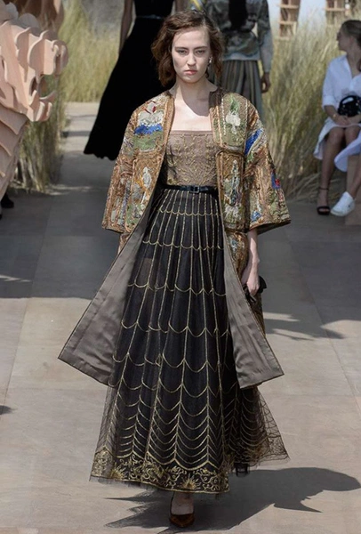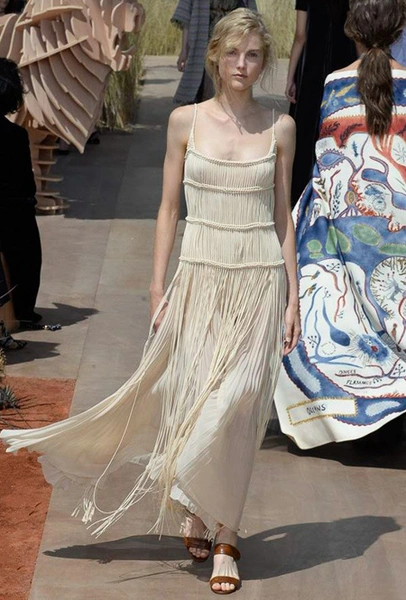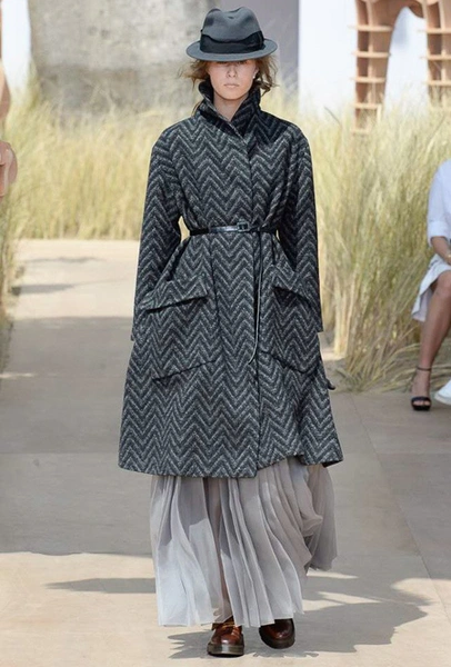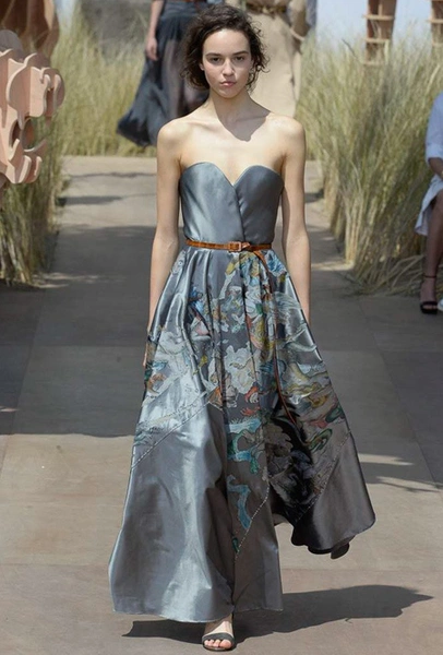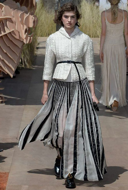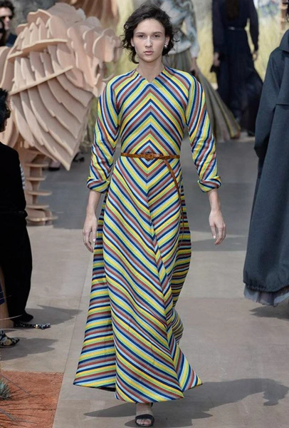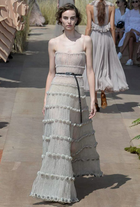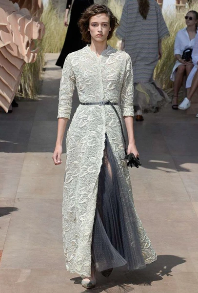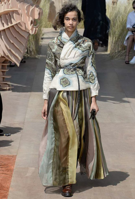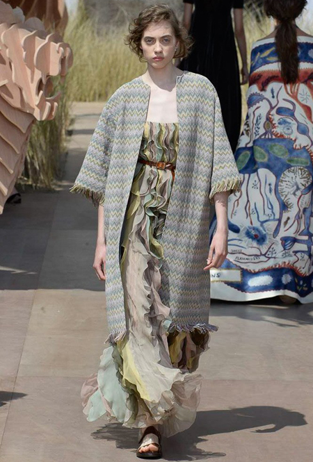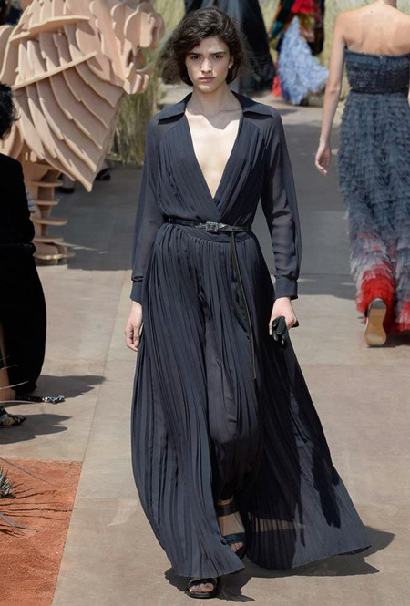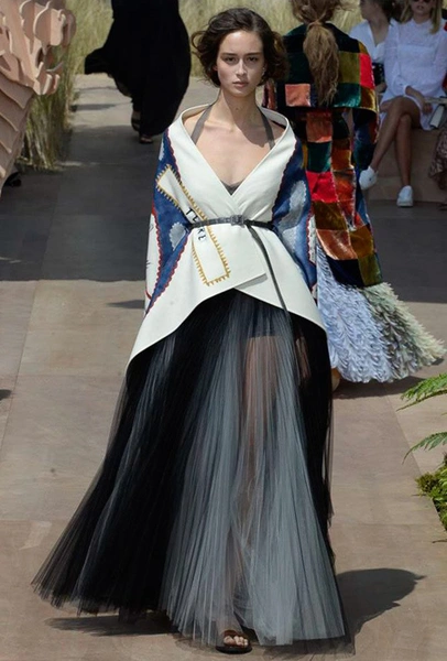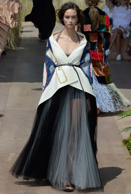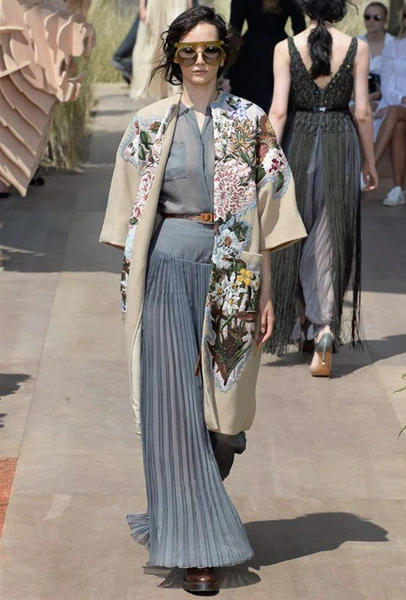Новую коллекцию Мария Грация посвятила путешествиям и тем местам, в которых побывал в свое время сам Диор – от Италии до Индии, от Японии до Южной Америки. Здесь есть длинные платья с графичным прямоугольным воротом, отсылающие к полотнам мастеров итальянского Возрождения, пончо с бахромой и пальто, сшитые из цветных лоскутов, словно одеяния женщин из индейских племен; жакеты с запахом, похожие на кимоно и принты в стиле старинных японских картин.