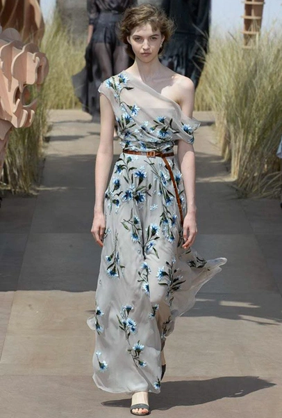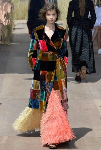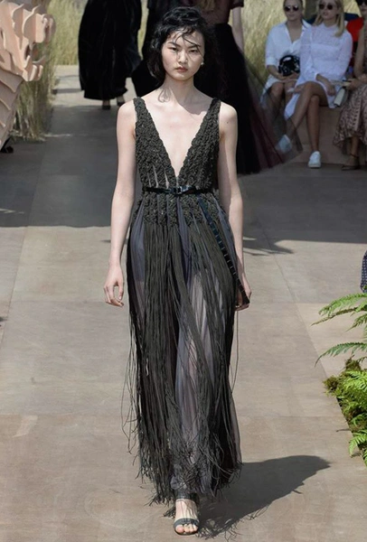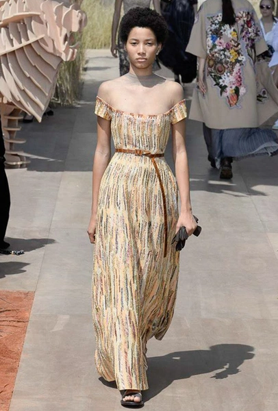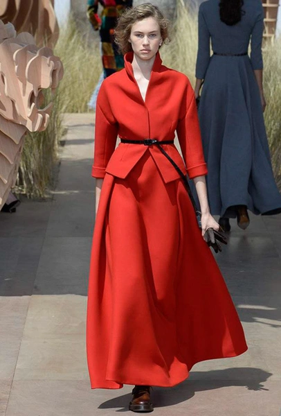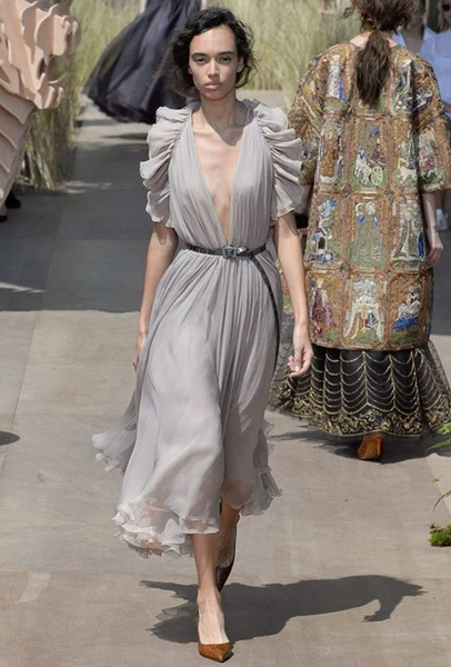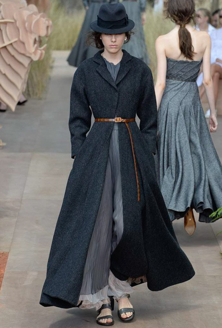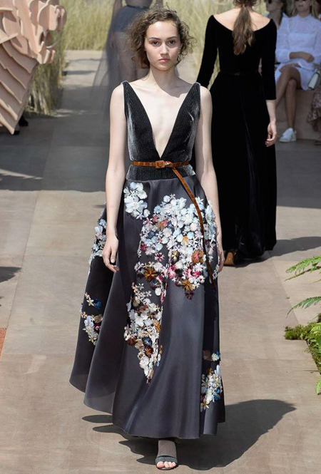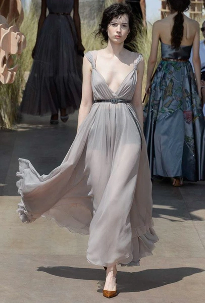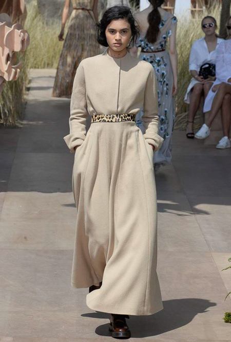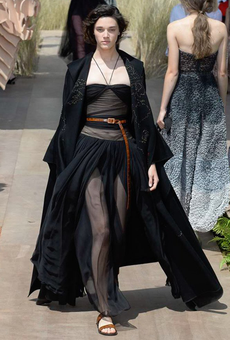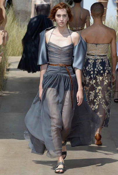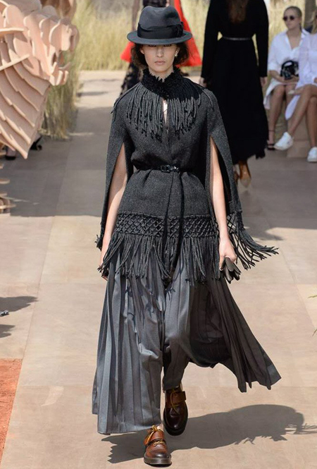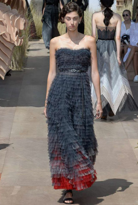 Новую коллекцию Мария Грация посвятила путешествиям и тем местам, в которых побывал в свое время сам Диор – от Италии до Индии, от Японии до Южной Америки. Здесь есть длинные платья с графичным прямоугольным воротом, отсылающие к полотнам мастеров итальянского Возрождения, пончо с бахромой и пальто, сшитые из цветных лоскутов, словно одеяния женщин из индейских племен; жакеты с запахом, похожие на кимоно и принты в стиле старинных японских картин.