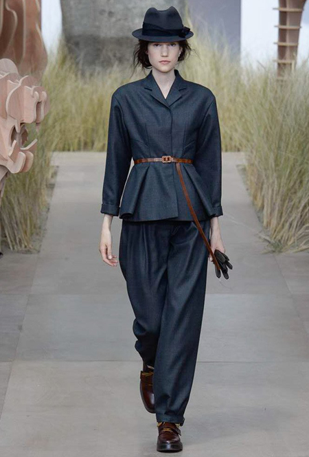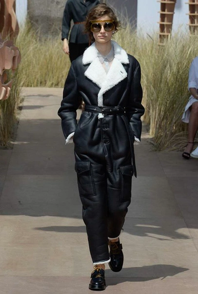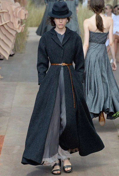 Как и следовало ожидать, в коллекции есть немало отсылок к классике Dior. О ней напоминают приталенные силуэты в стиле new look, бар-жакет во множестве вариаций и отложные воротники. На контрасте с этим – аксессуары и обувь. Они здесь нарочито «унисекс», если не сказать маскулинные: фетровые шляпы, массивные темные очки, похожие не то на горнолыжные, не то на те, что носят летчики и грубые кожанные ботинки на шнурках и толстой подошве. В таких удобно гулять по прериям и по мощенным улицам.