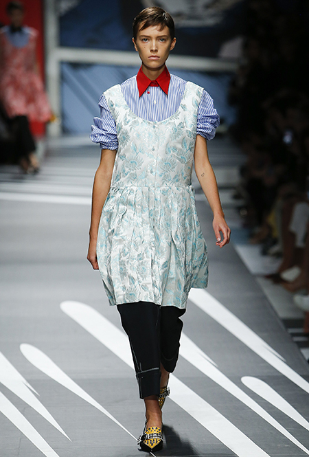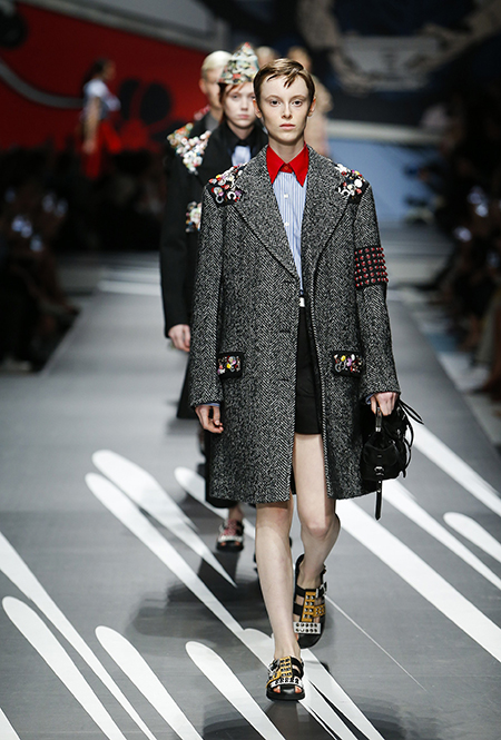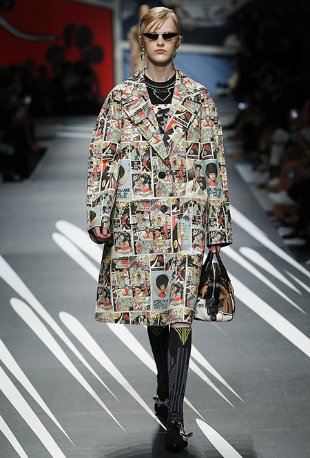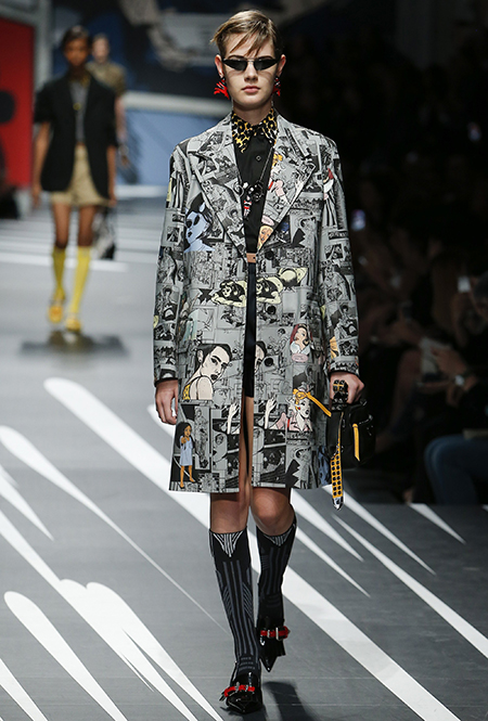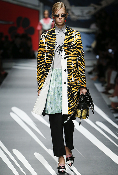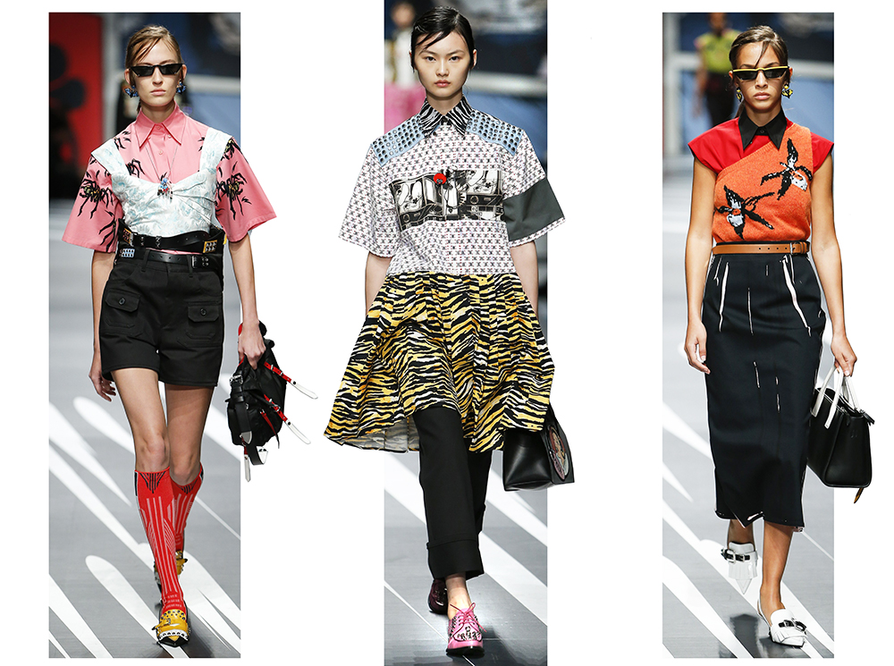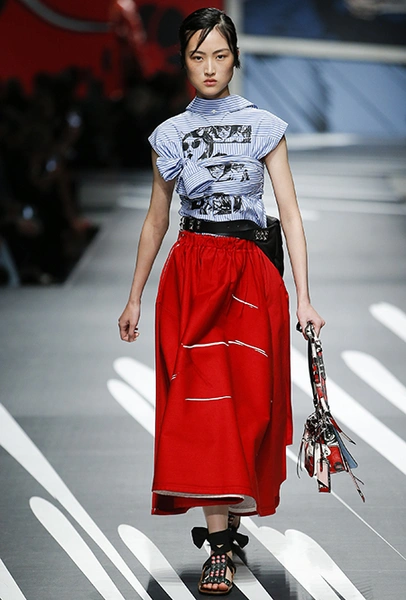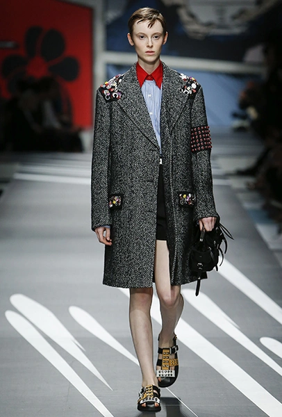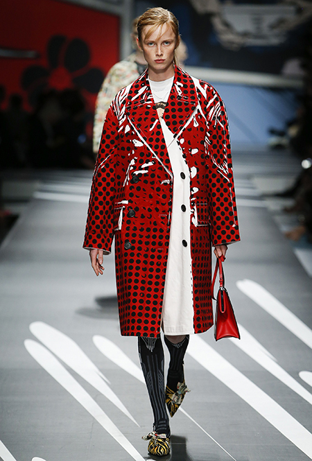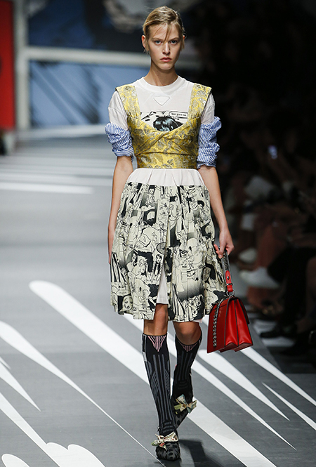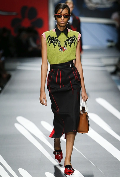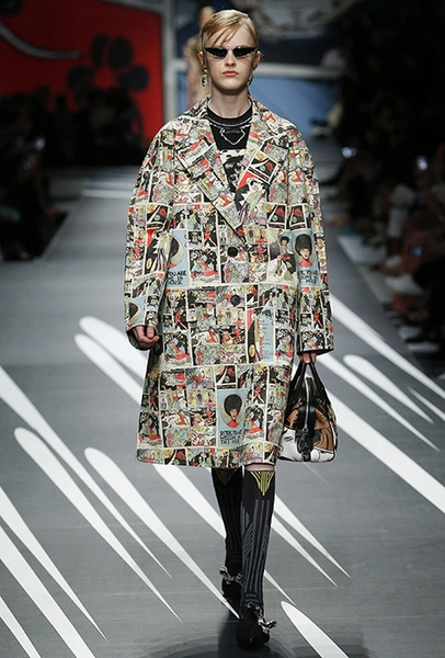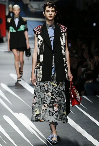 Принтам коллекции можно было бы посвятить отдельный материал. Кроме вышеупомянутых цветочных узоров, похожих на восточную вышивку, здесь есть и белые и красные полосы, напоминающие следы от трафарета, и вышитые пауки и рисунки, словно сошедшие со страниц книжки-комикса (их создали для Прады восемь разных художниц). Словом, модели на показе немного напоминали живые арт-объекты ─ не даром показ прошёл в арт-пространстве Fondazione Prada.
