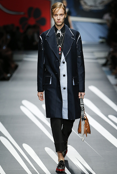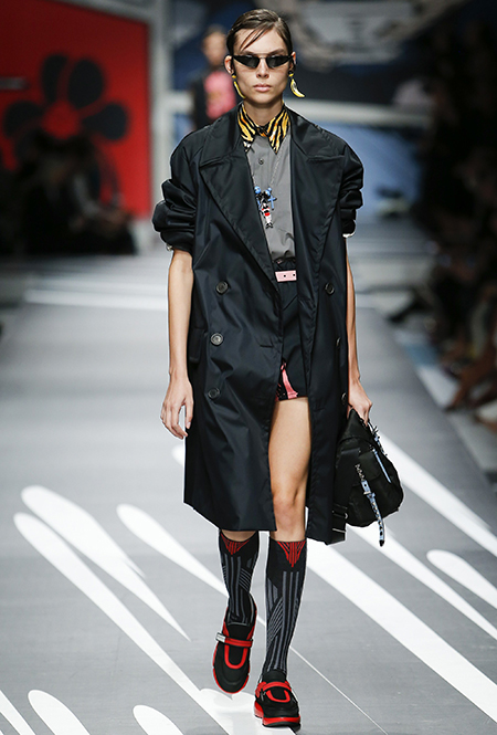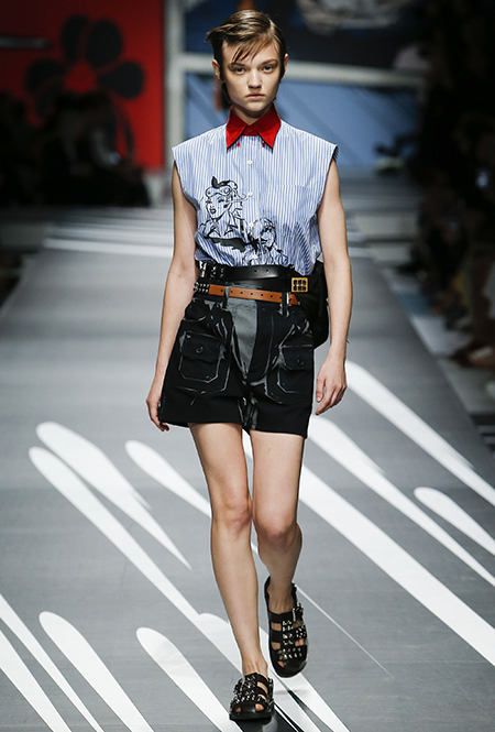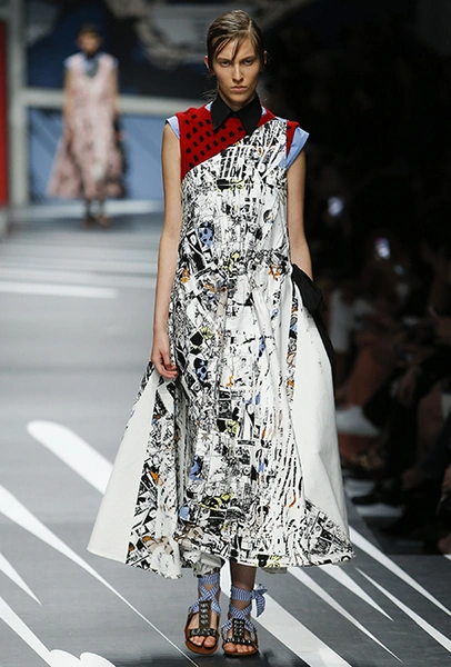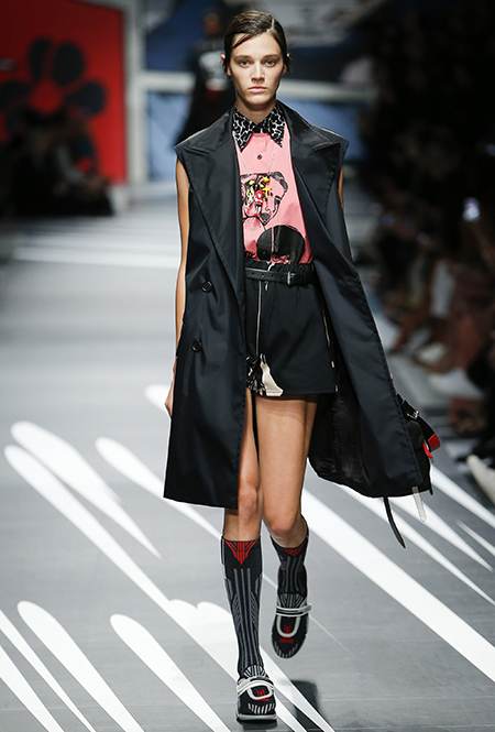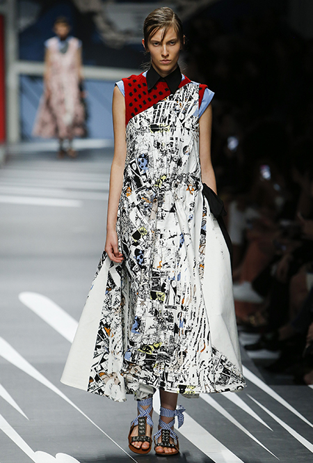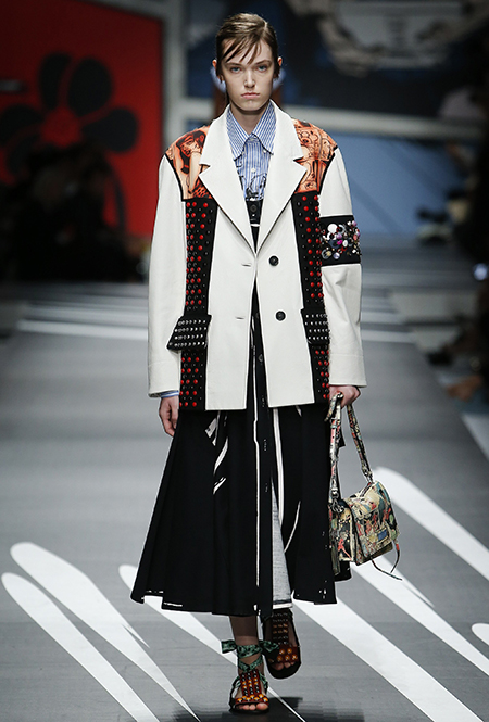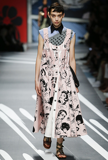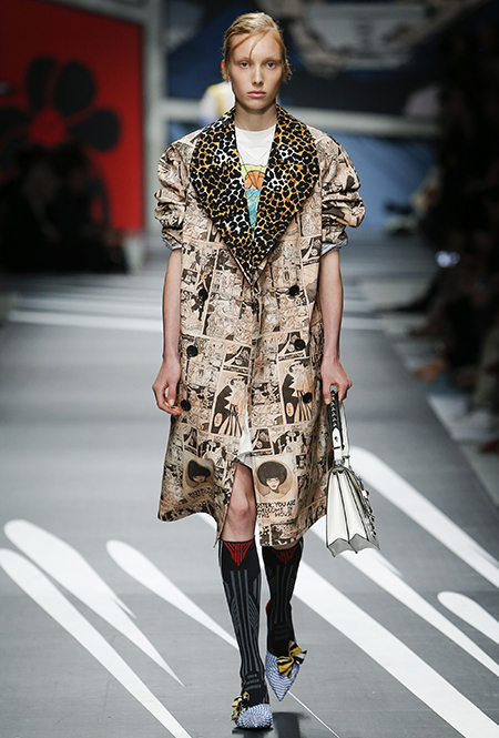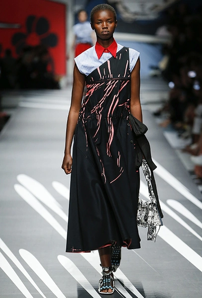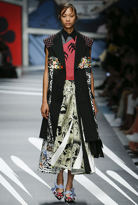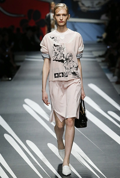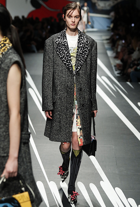 Принтам коллекции можно было бы посвятить отдельный материал. Кроме вышеупомянутых цветочных узоров, похожих на восточную вышивку, здесь есть и белые и красные полосы, напоминающие следы от трафарета, и вышитые пауки и рисунки, словно сошедшие со страниц книжки-комикса (их создали для Прады восемь разных художниц). Словом, модели на показе немного напоминали живые арт-объекты ─ не даром показ прошёл в арт-пространстве Fondazione Prada.