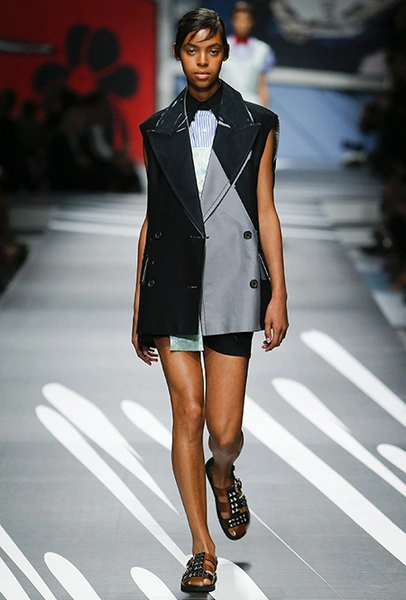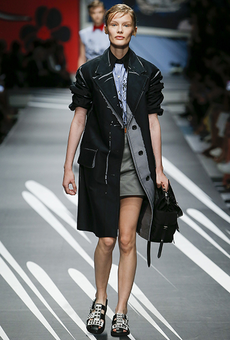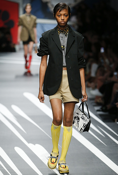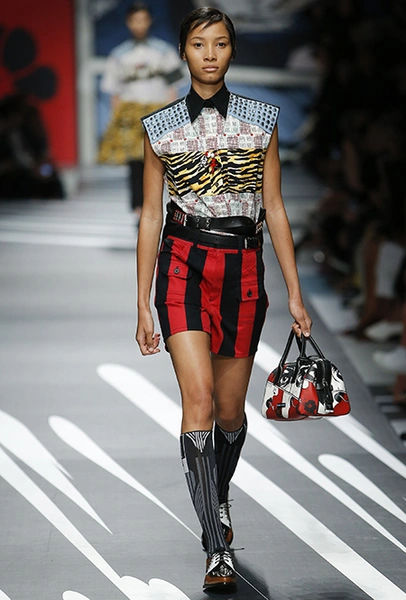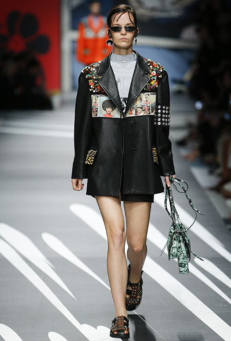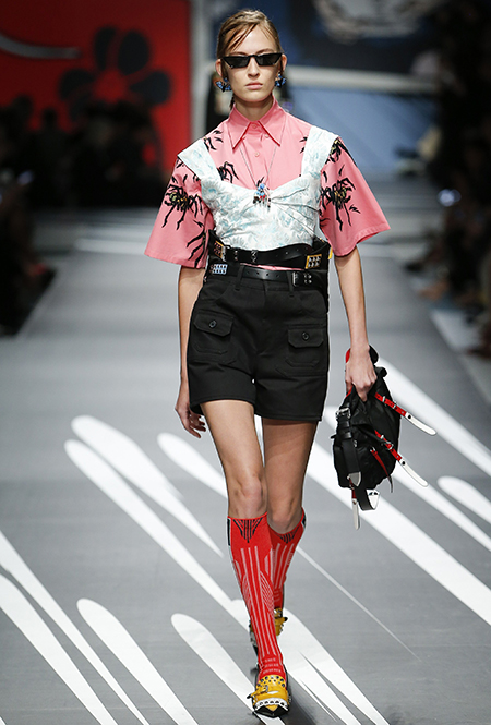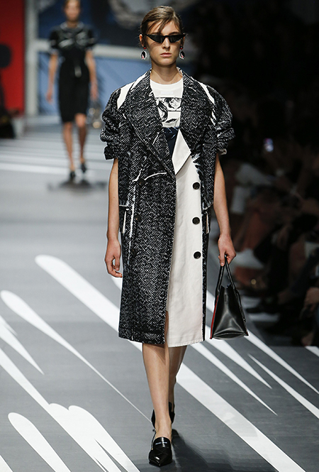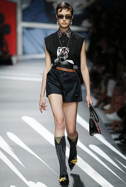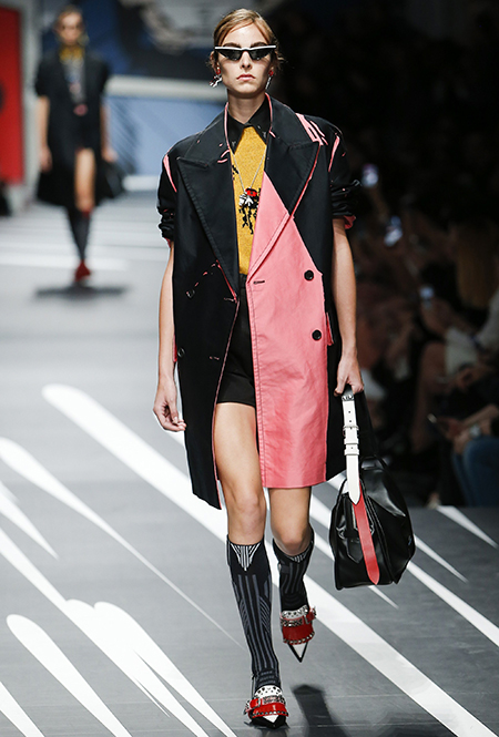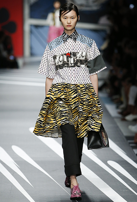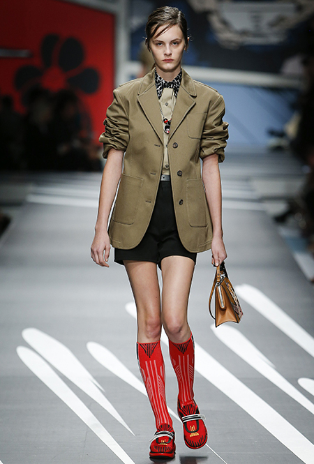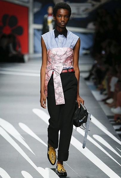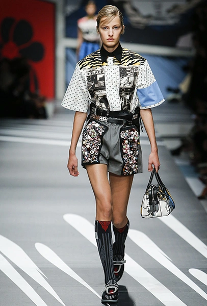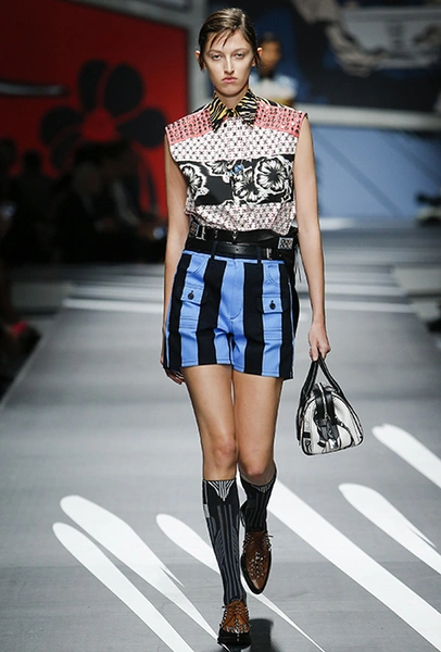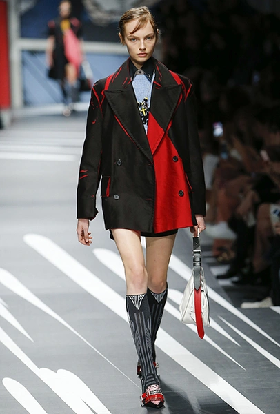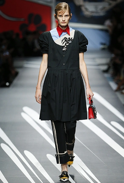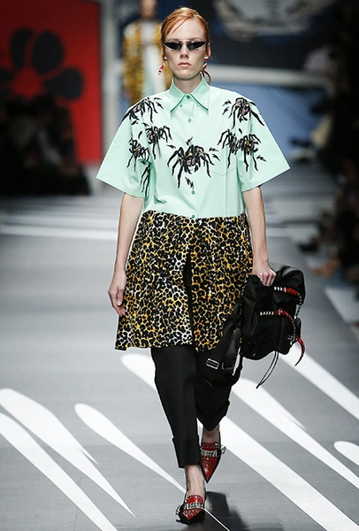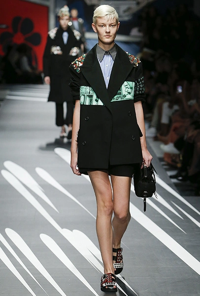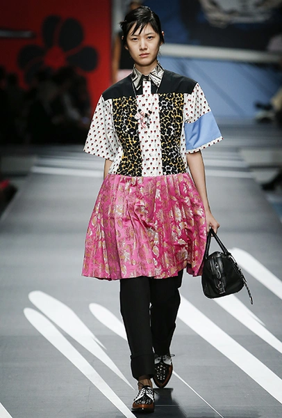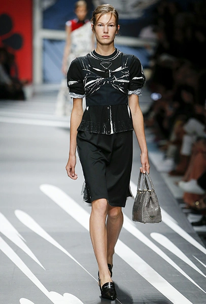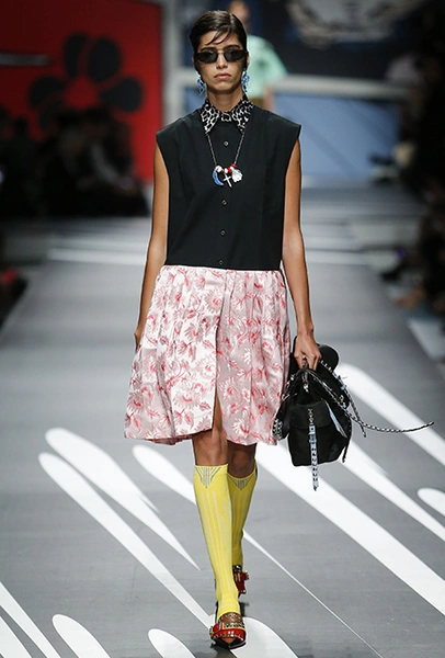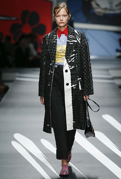 Новая коллекция Prada оказалась именно такой, какой ее ожидали увидеть - эклектичной, яркой, с налетом ретро и щепоткой безумия. Цвета и принты на подиуме были замиксованы так же причудливо как песни в саундтреке, где Сюзан Вегу сменяла Лана дель Рей, а ее, в свою очередь, тяжелый рок. Каждая песня звучала меньше, чем минуту - идеальное музыкальное сопровождение для мира, где все стремительно меняется.