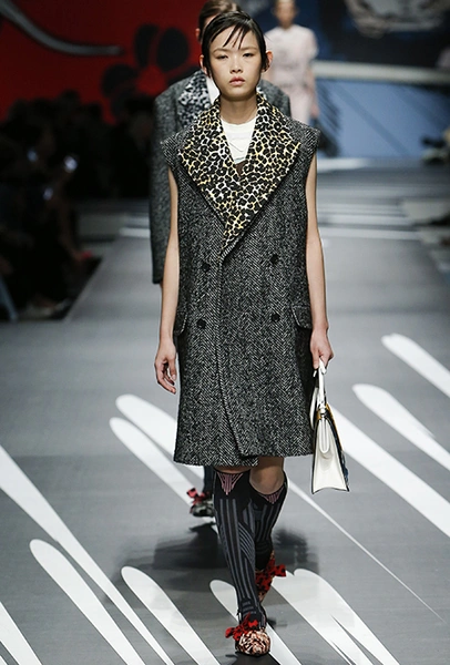 Вещи тоже были этакой попыткой охватить все и сразу. Чёрный монохром, кислотный «леопард», цветочный принт и крупный горох Миучча запросто сочетает в одном луке. Да что там! В одной вещи. Например, у темно-серого пальто без рукавов (очень, кстати, популярная в коллекции вещь) может быть леопардовый воротник, а на лифе ─ вставки, вышитые разноцветным стеклярусом.