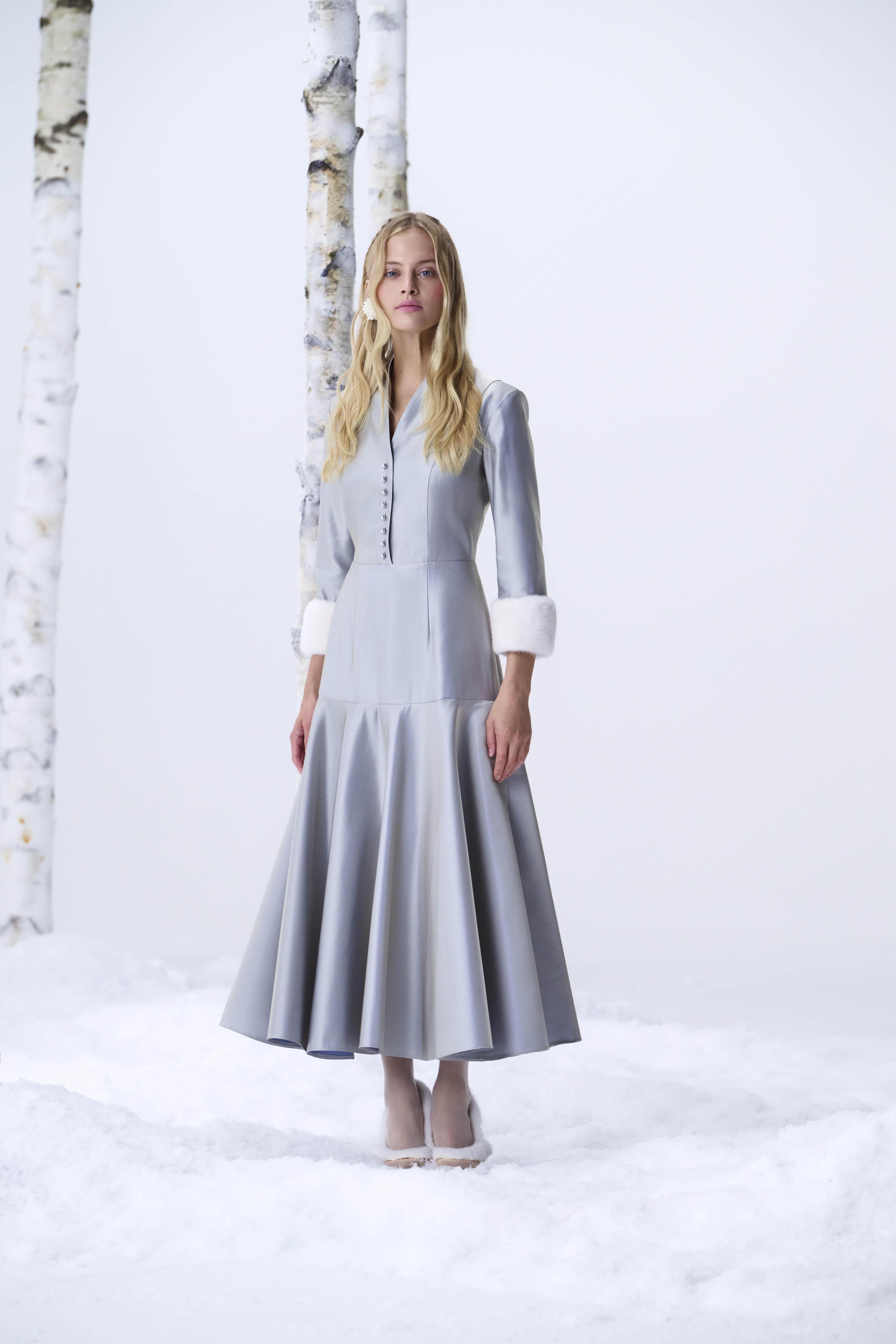 Пальто «Купава» прямого силуэта выполнено из шерсти и кашемира, украшено съемным воротником из меха норки. Обтяжные пуговицы и кружевной подборт подчеркивают внимание к деталям. Кейп «Забава» с объемной вышивкой по мотивам морозных узоров дополняет вечерние образы и может заменить жакет в торжественных комплектах.