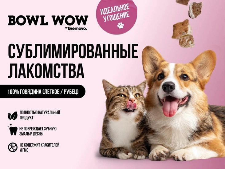 Бренд кормов холистик-класса BOWL WOW by Evernovo представил линейку натуральных лакомств для собак. Это сублимированные кусочки свежего мяса — отборное говяжье легкое и рубец без добавок, зерна и консервантов. В составе до 77% белка, что даст мощный заряд энергии для игр и приключений. При этом состав низкоаллергенный. Текстура лакомства пористая и подойдёт для хвостатых малышей с 3 месяцев. Можно давать сухим или восстановленным — выбор за четвероногим гурманом.