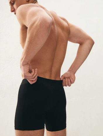 В коллекциях российского бренда SHU есть буквально все для базового капсульного гардероба, и трусы не исключение. Пока у марки можно найти одну модель боксеров в четырех цветах — черном, белом, сером и темно-синим. Трусы сшиты из эластичного хлопка на плоской широкой резинке, комфортная базовая модель с плоскими швами подойдет на каждый день. На комплект из двух трусов действует скидка.