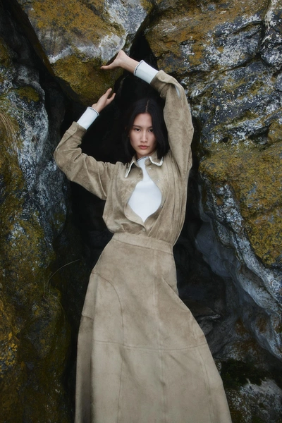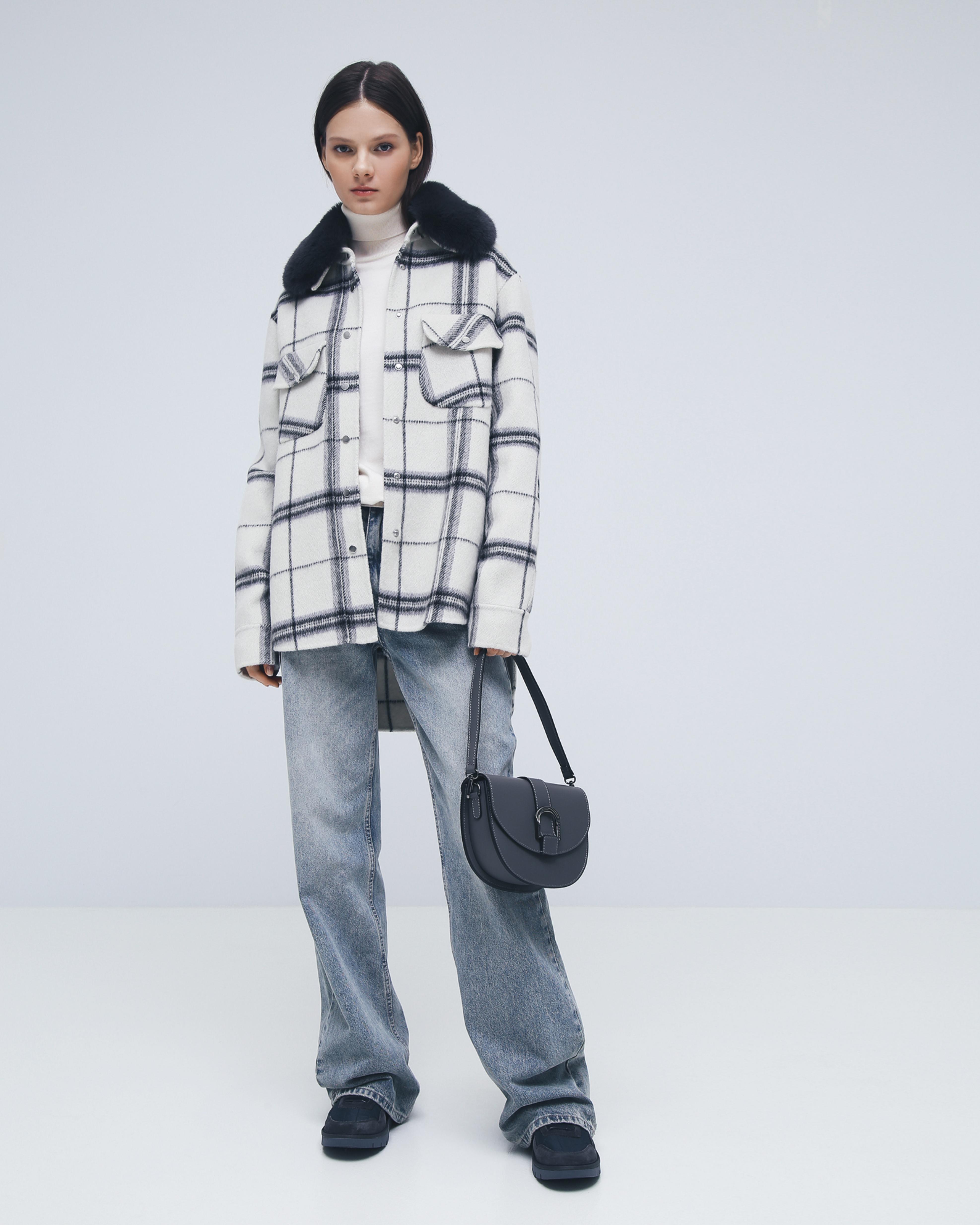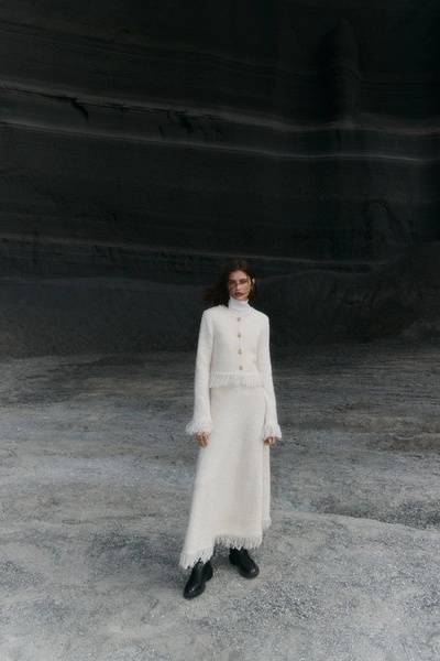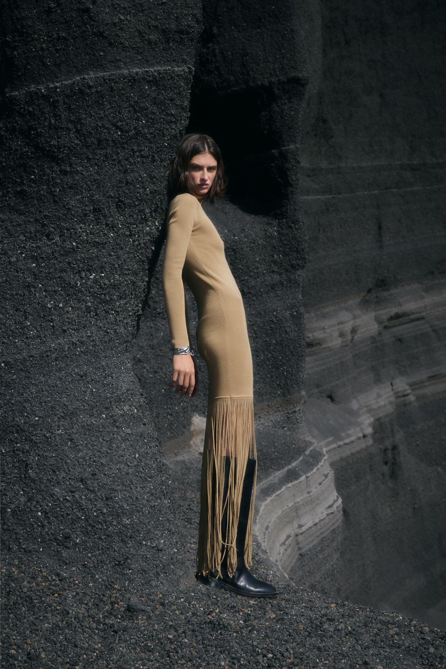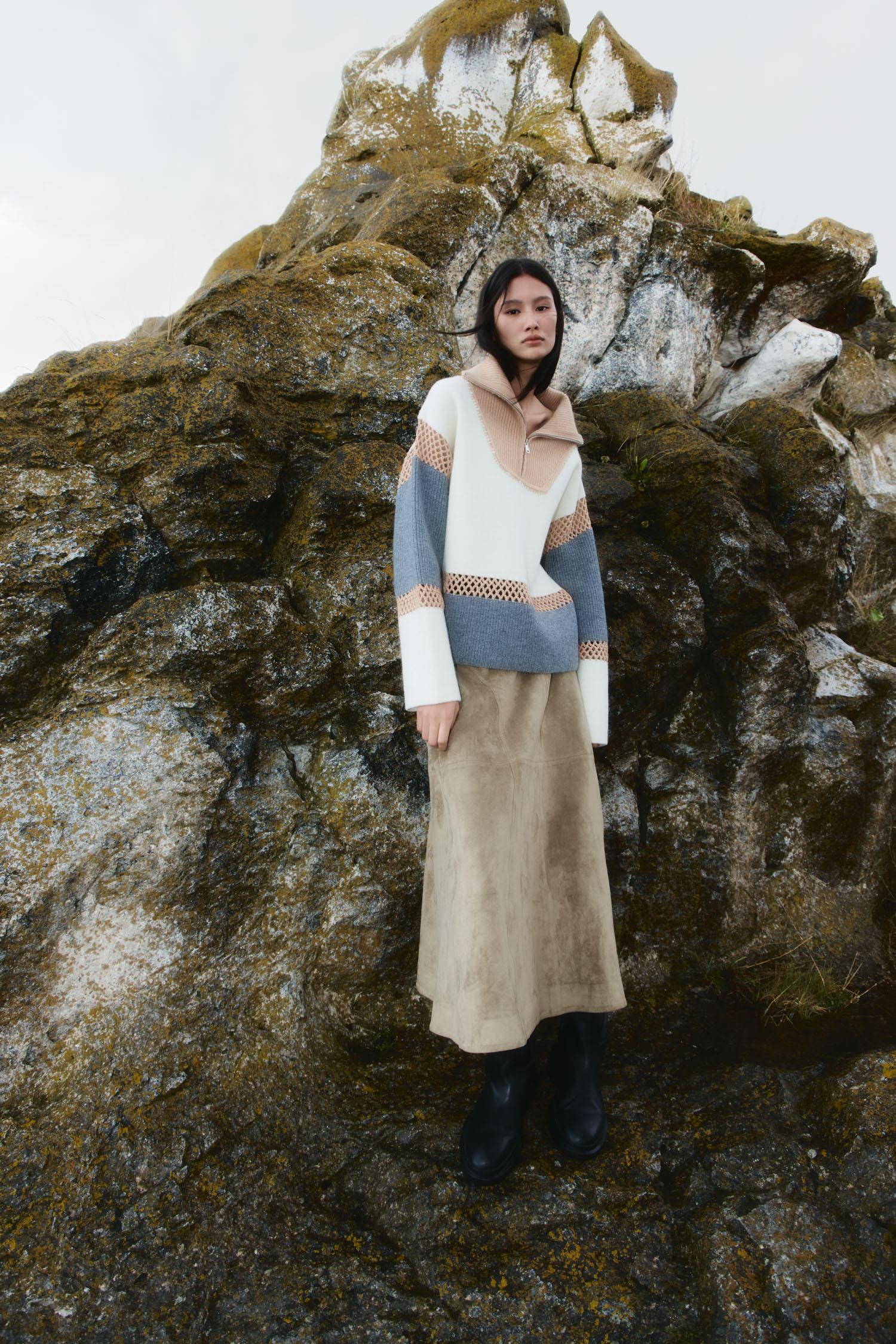 Ключевые модели — длинная юбка с бахромой и кардиган в молочном цвете из трикотажа с мохером, свитеры со сложным этническим орнаментом и с элементами ручной работы, а также платья-рубашки. Их стилисты предлагают сочетать с водолазкой или с брюками из экокожи со шнуровкой по бокам. Также среди новинок — трикотажное платье из вискозы с бахромой. А завершат образы высокие сапоги из натуральной кожи.