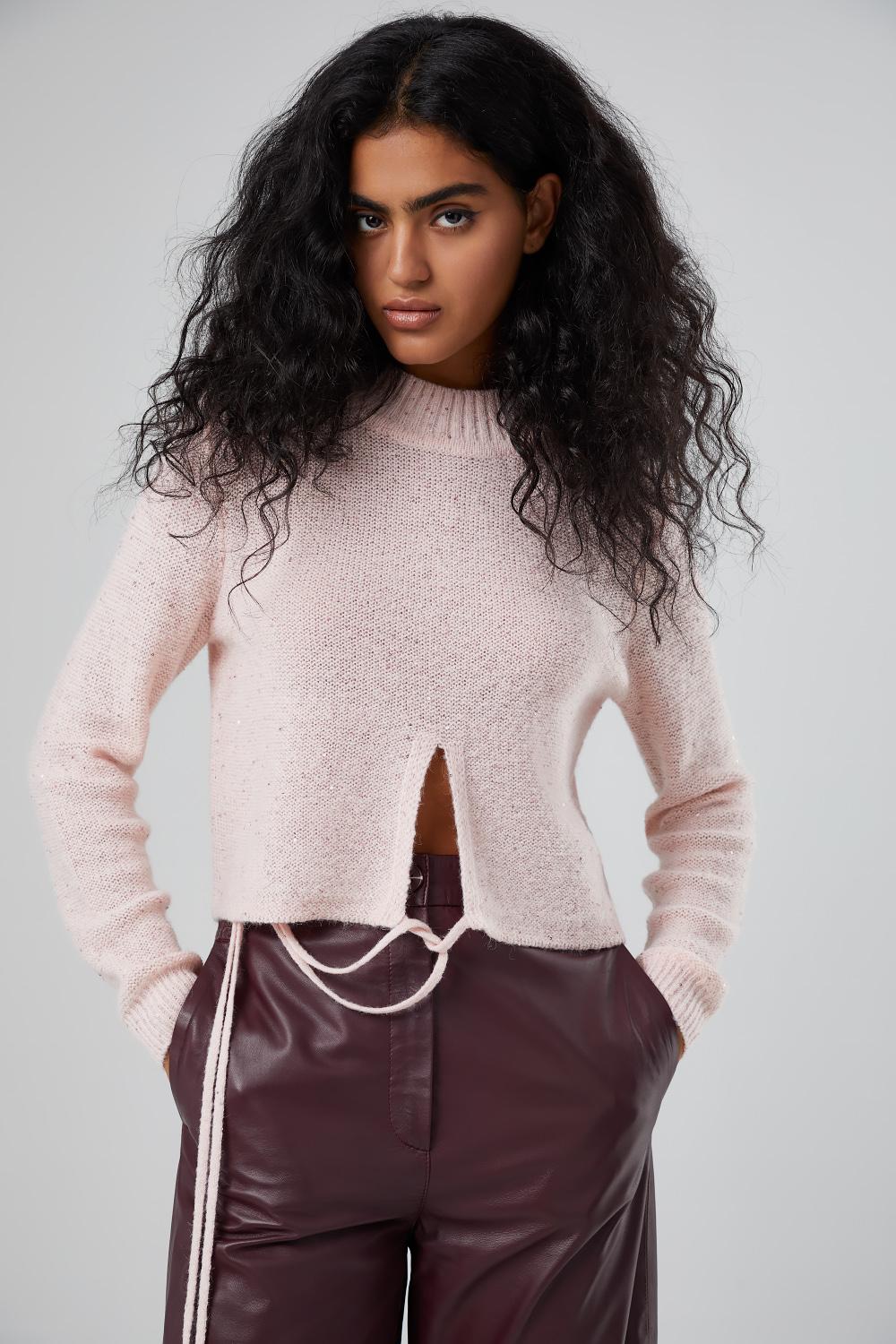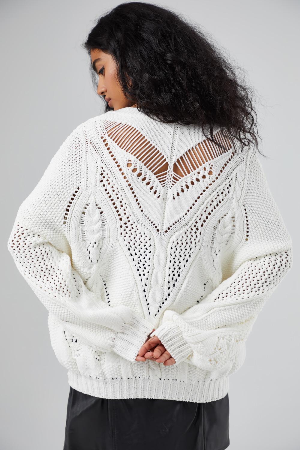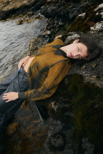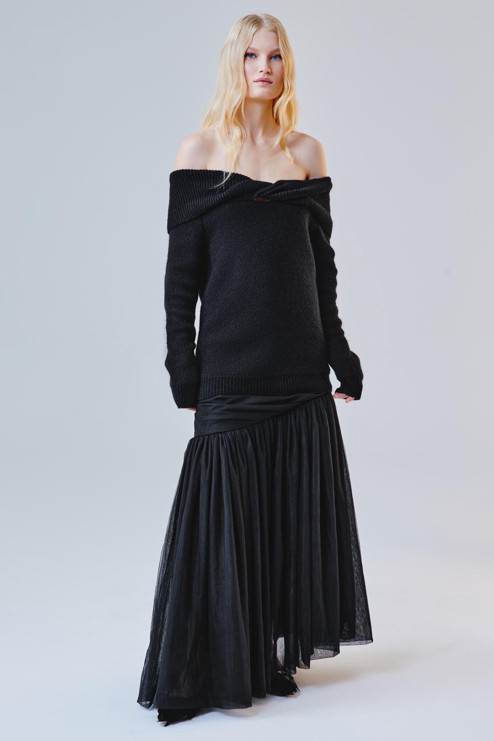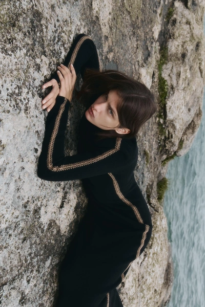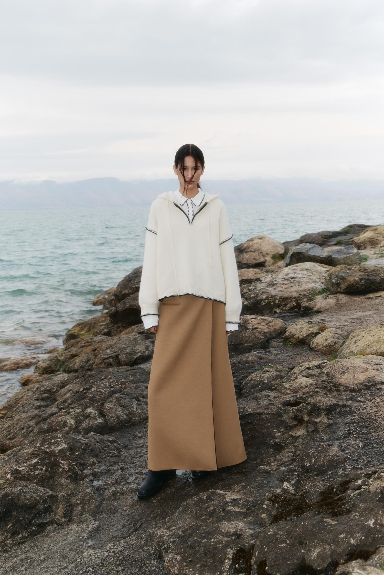 Ключевые модели — длинная юбка с бахромой и кардиган в молочном цвете из трикотажа с мохером, свитеры со сложным этническим орнаментом и с элементами ручной работы, а также платья-рубашки. Их стилисты предлагают сочетать с водолазкой или с брюками из экокожи со шнуровкой по бокам. Также среди новинок — трикотажное платье из вискозы с бахромой. А завершат образы высокие сапоги из натуральной кожи.