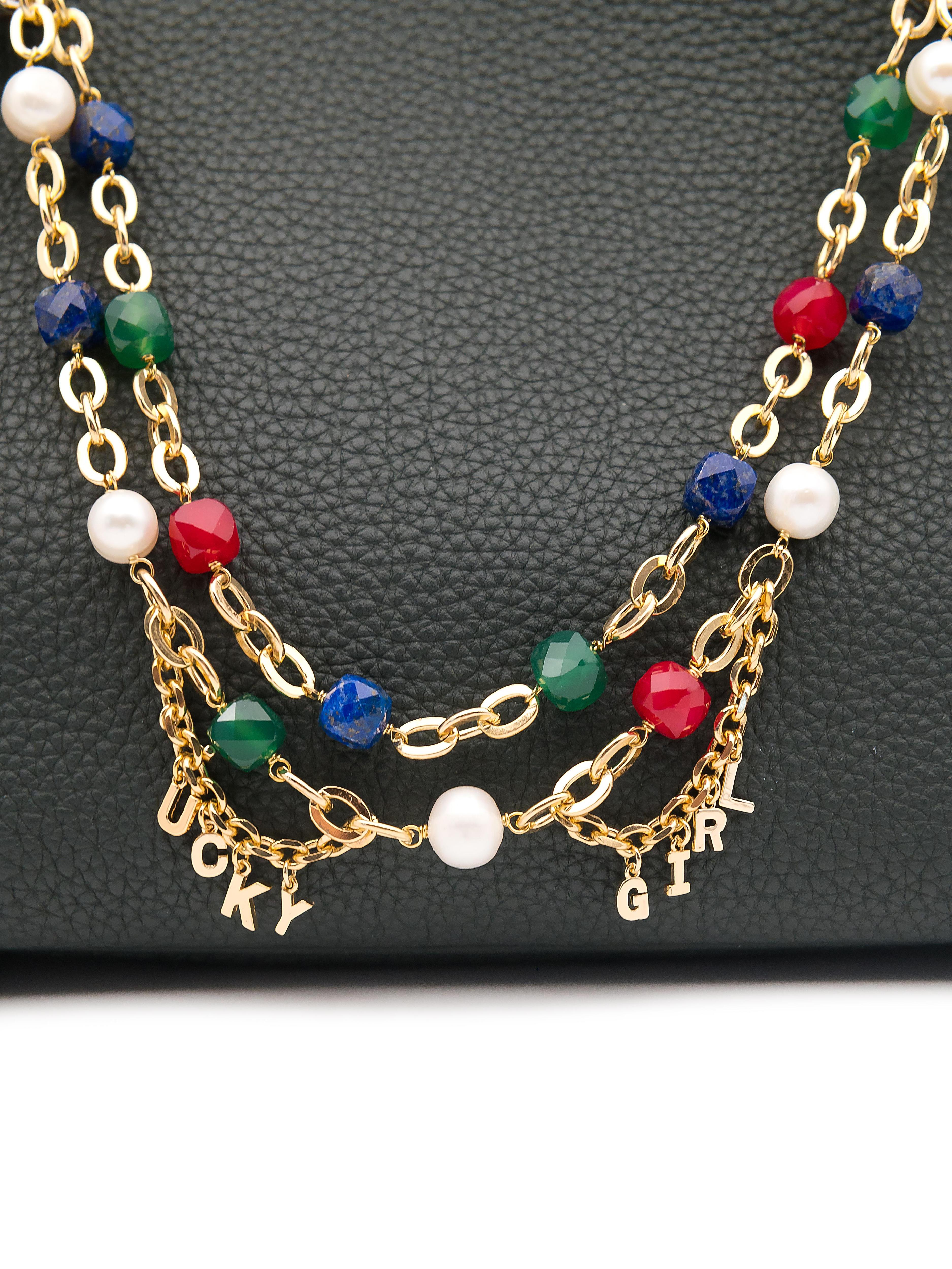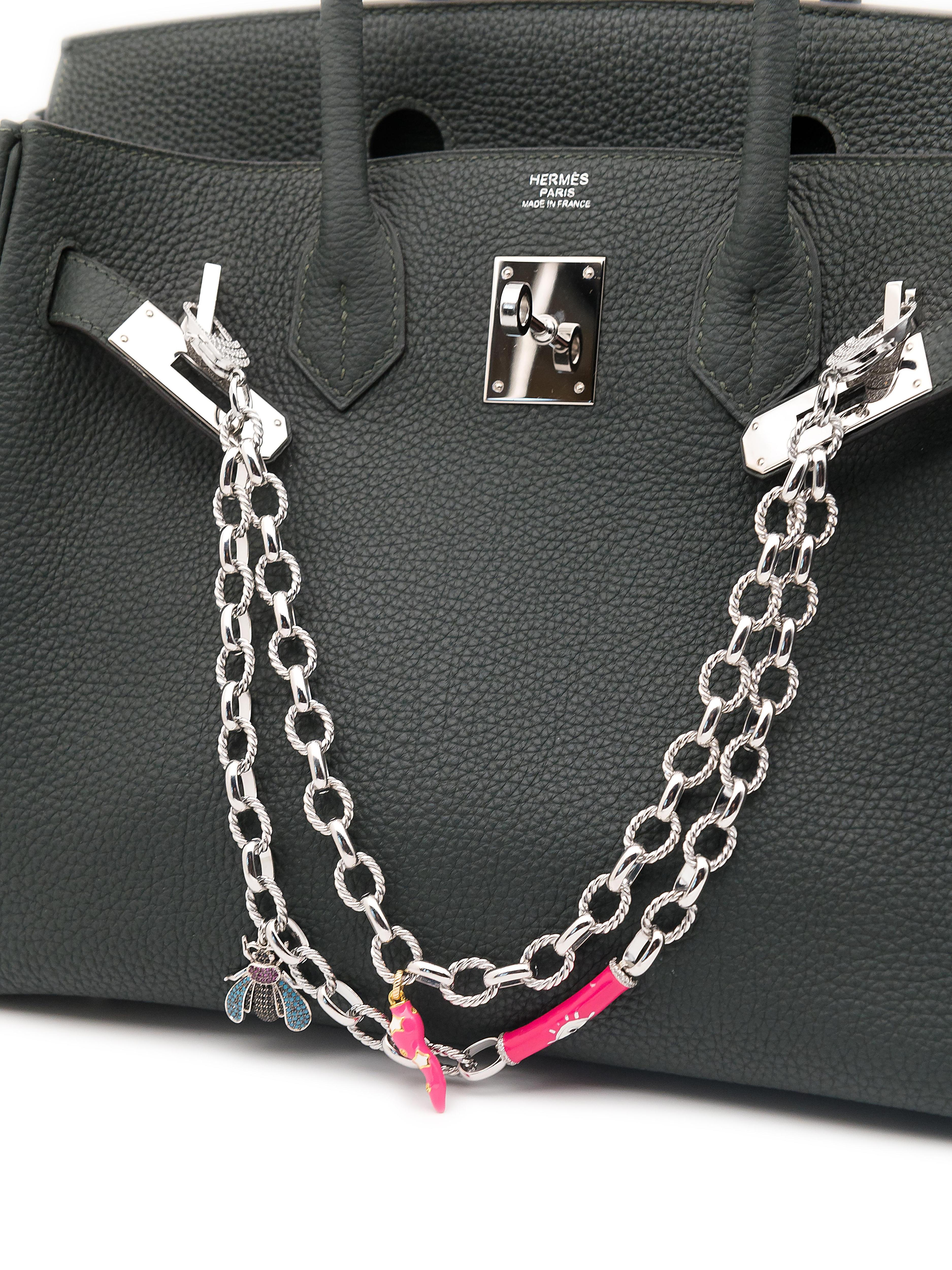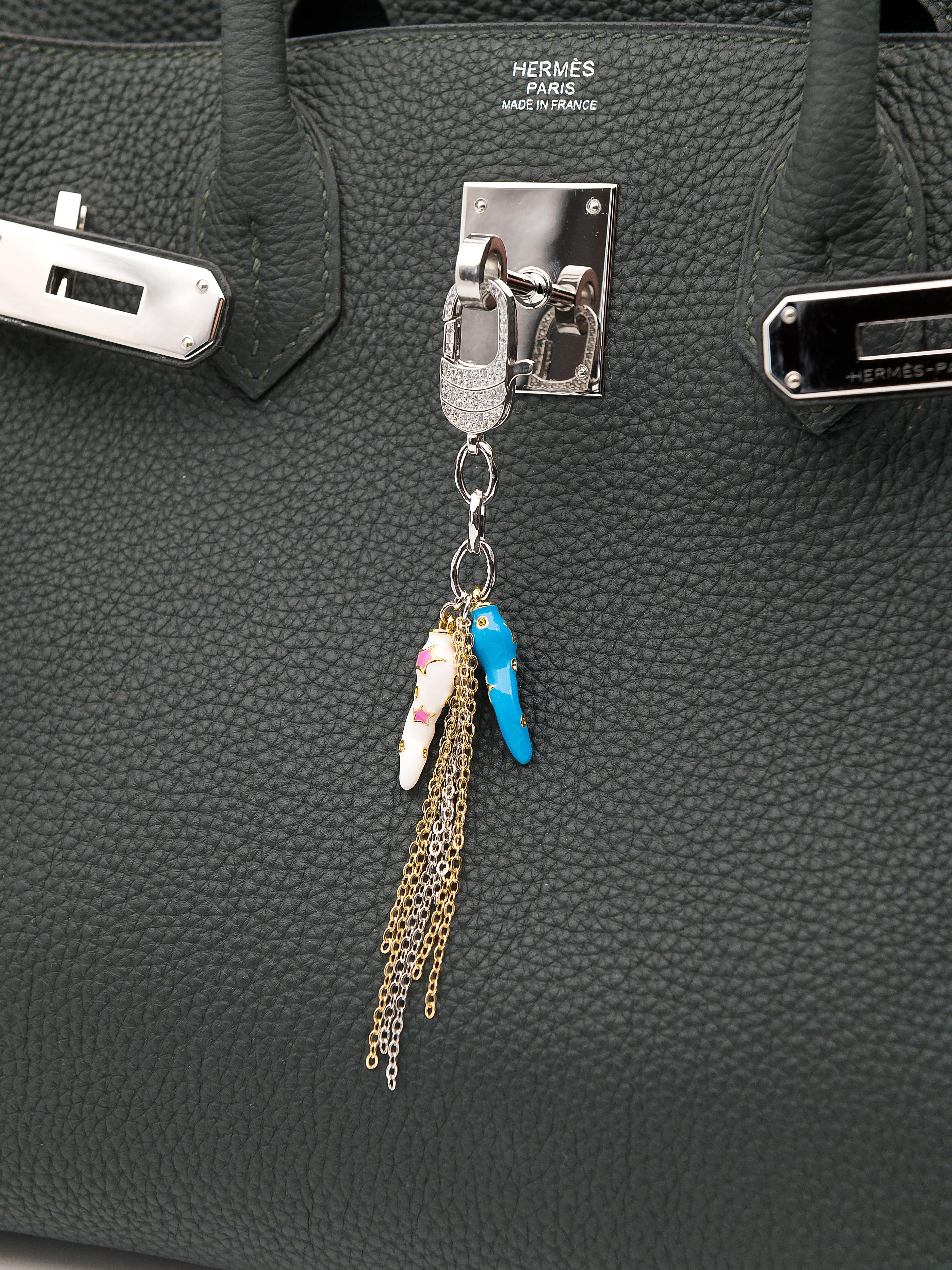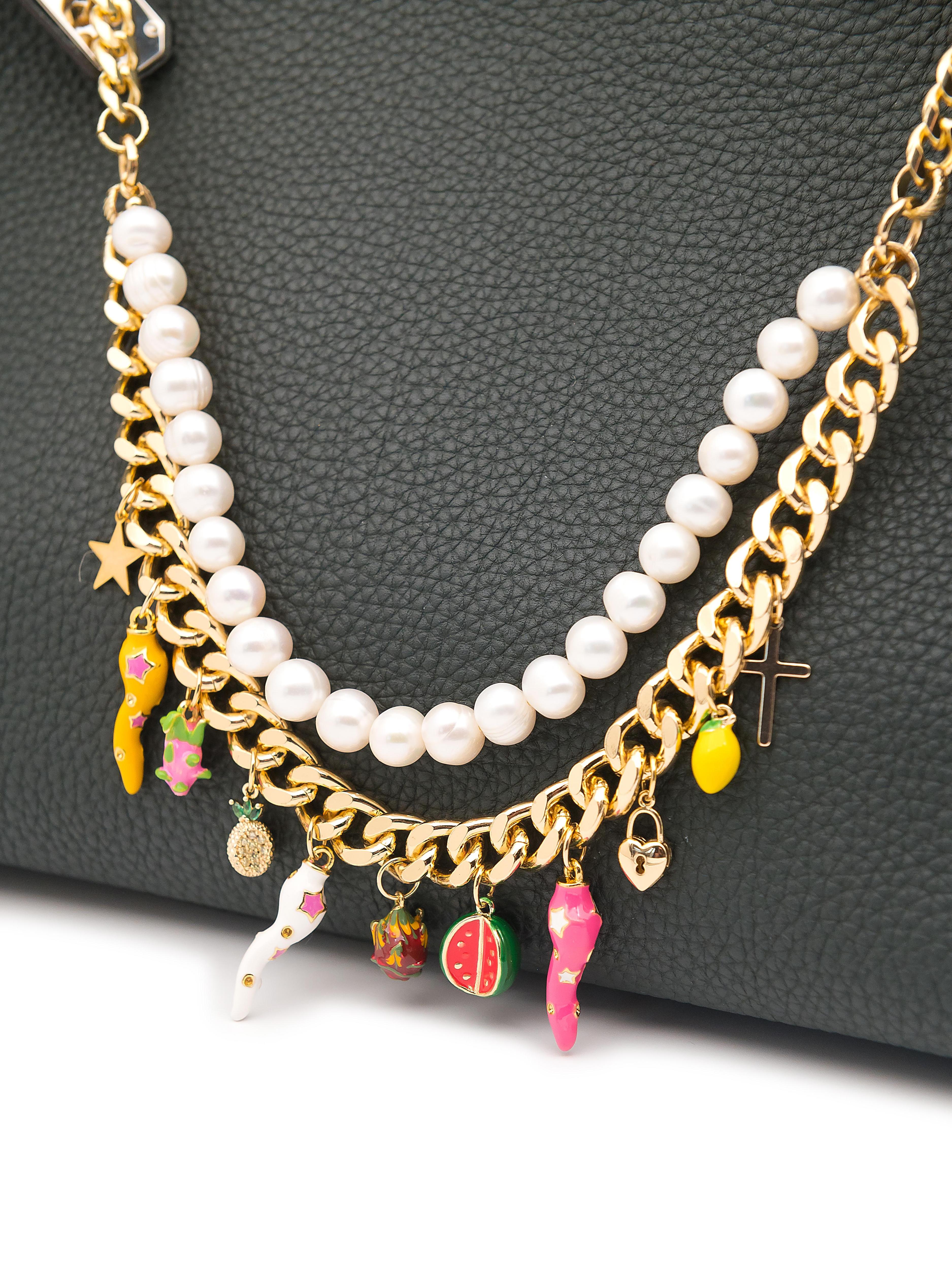 Модельный ряд новой коллекции можно разделить на 2 категории: подвески-цепи и брелоки на карабине, украшенные стразами и перламутром, добавлены премиальный жемчуг, цветной агат, рубеллит и халцедон.