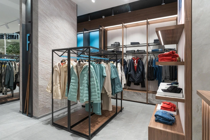 В ТРЦ «Европейский» открылось новое модное пространство Finisterre площадью 168 квадратов. Спокойные серо-бежевые тона подчеркивает фирменный бирюзовый оттенок бренда. В интерьере присутствуют декоративные элементы, создающие динамику новых открытий: камень, дерево и металл с их натуральной фактурой. Горные породы в интерьере напоминают о прибрежных скалах, деревянные ламели — о рыбацких домиках. Дизайнеры превратили лодки каноэ в зеркала, которые не только функциональны, но и поддерживают общую концепцию магазина.