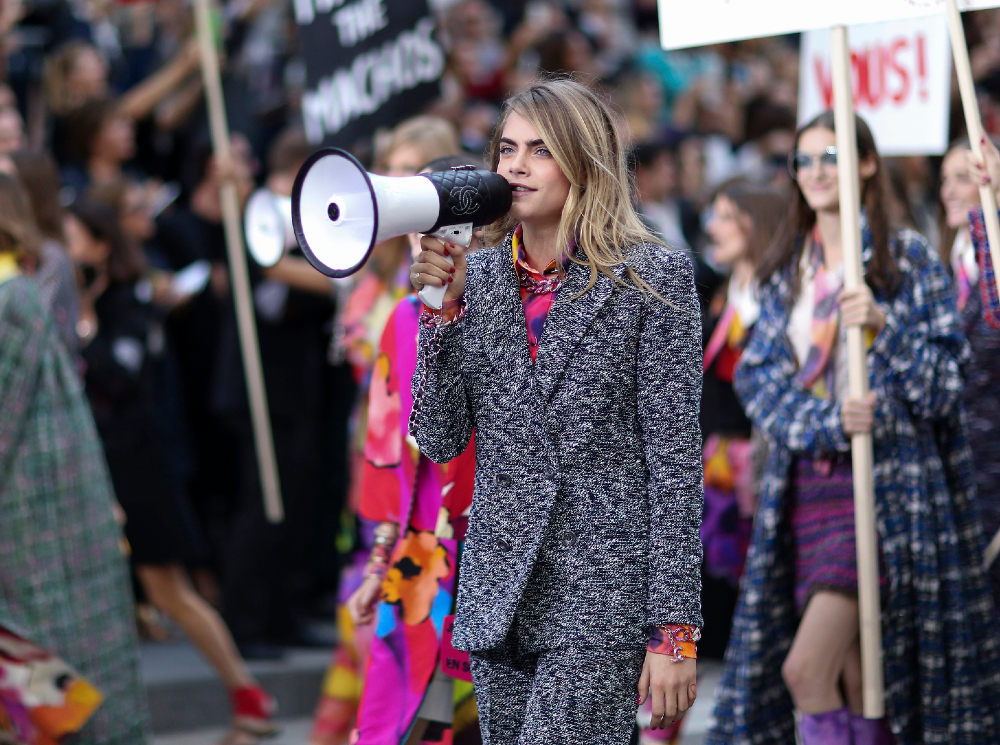 Карл Лагерфельд в 2014 вывел на подиум беременную модель в шлепанцах, а в 2015 году всех шокировал на показе Chanel, проведя на весеннем фэшн-шоу феминистский марш во главе со скандирующей Карой Делевинь и Каролин де Мегре. Модели дефилировали с табличками «Be Your Own Stylist», «Ladies First», «Free Freedom» и «Make Fashion Not War» («Будьте своим собственным стилистом», «Сначала леди», «Свободная свобода» и «Делай моду, а не войну»), показ закрывал мужчина с табличкой «He for She» ( «Он для Нее»). Шоу, как можно понять по призывам, было направлено против гендерного неравенства.