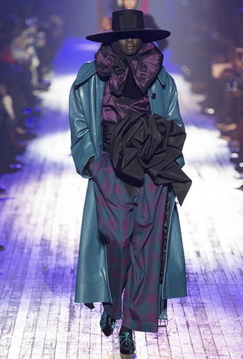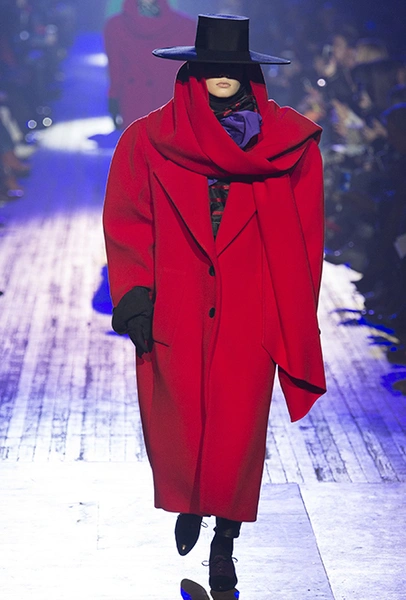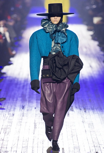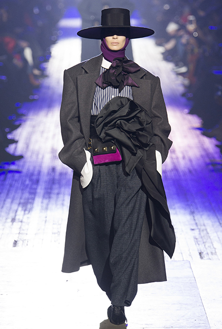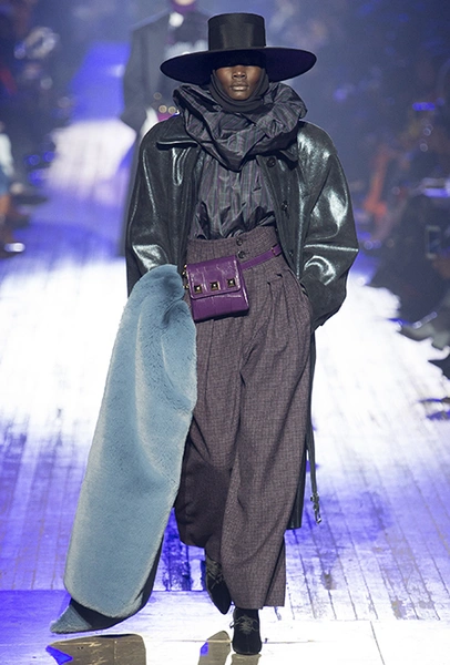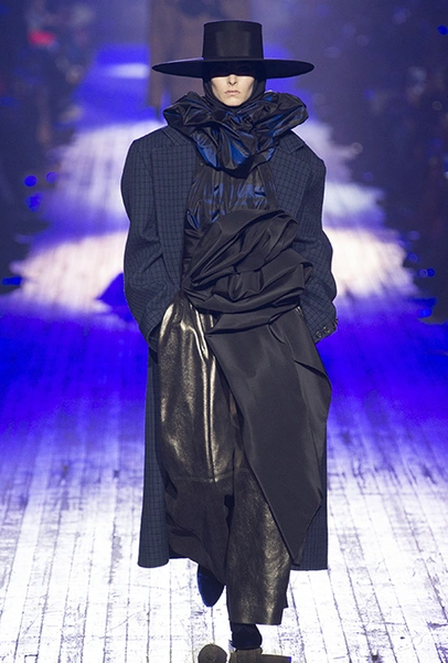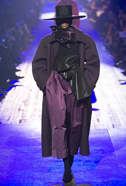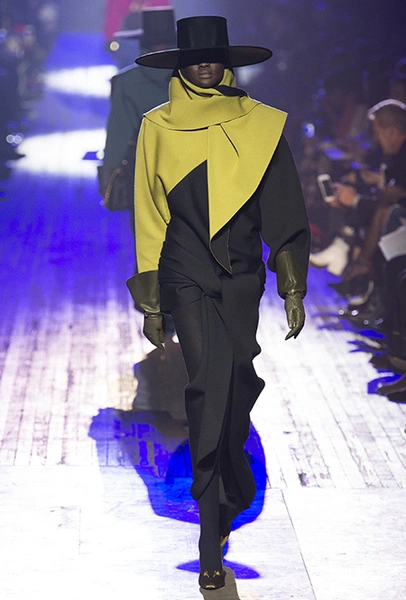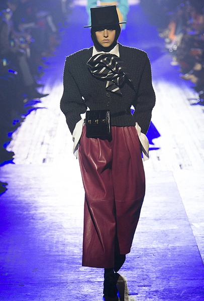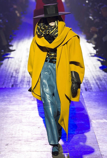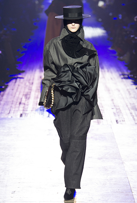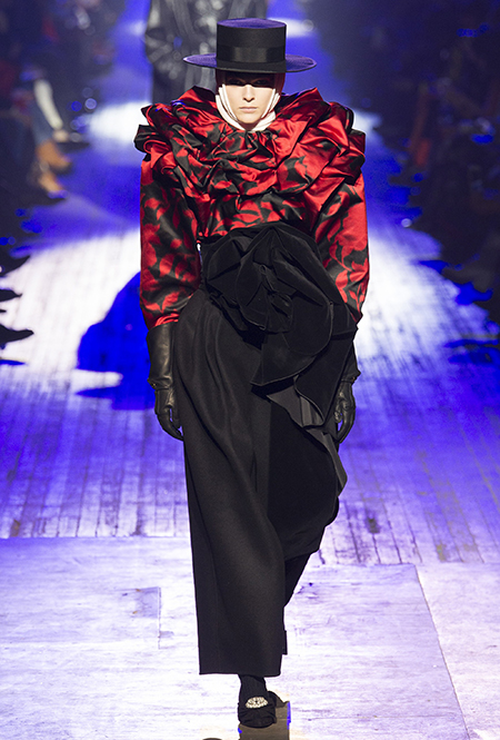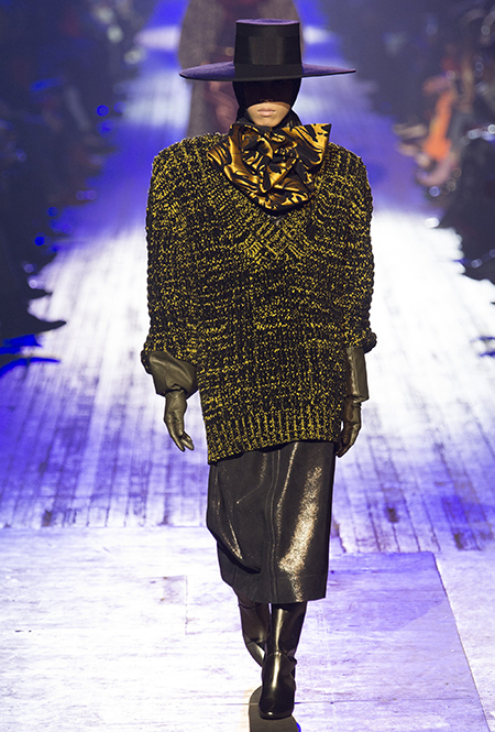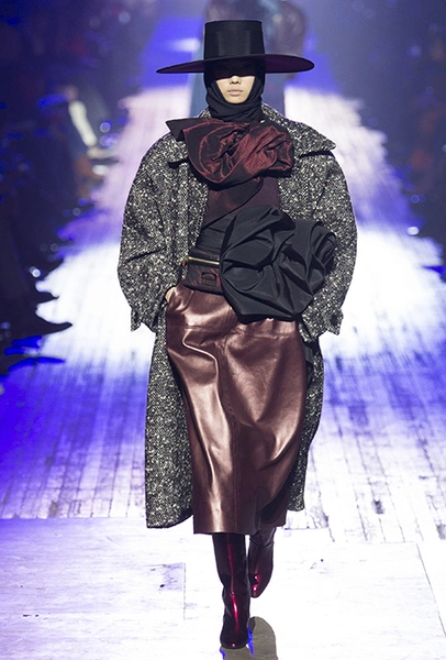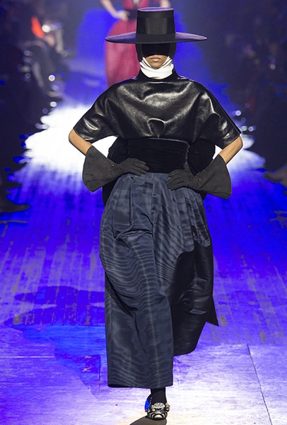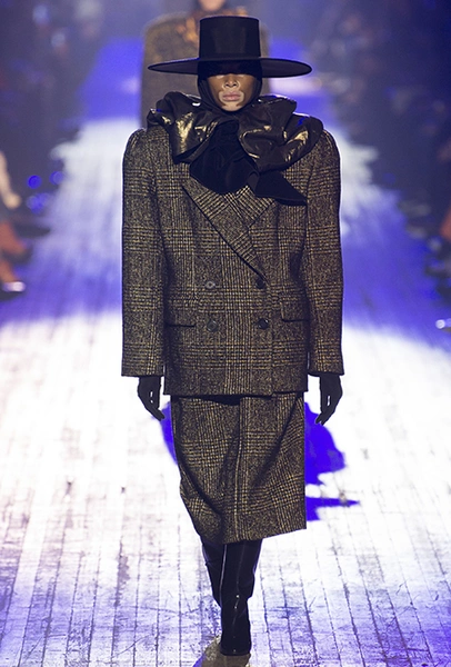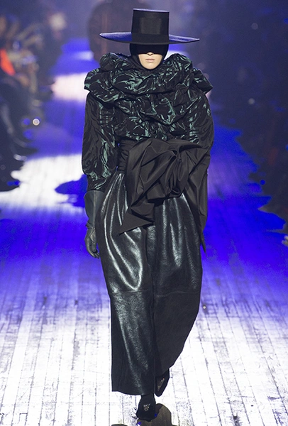 Связующим звеном всей коллекции стали черные, широкополые шляпы, автор которых – модист Стивен Джонс. Аллюзии на них на раз-два отыскались в весенне-летней коллекции 1989 года Ива Сен-Лорана, в показах которого головным уборам всегда отводилась немаленькая роль.