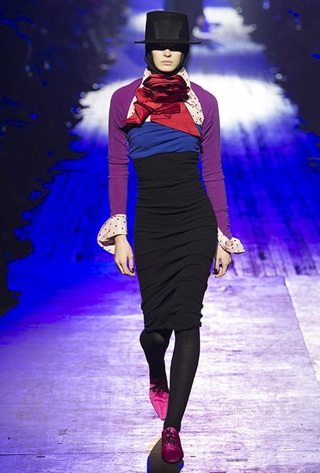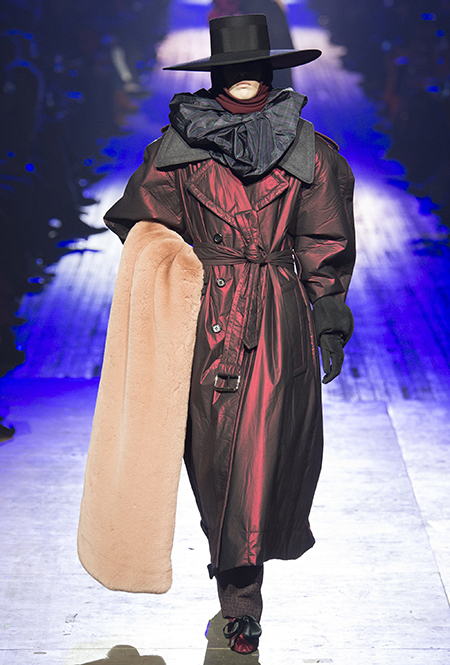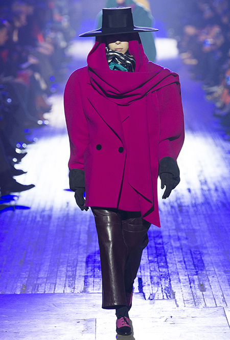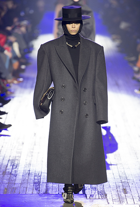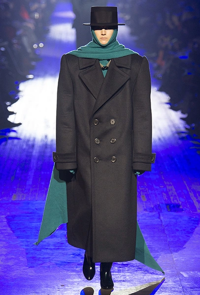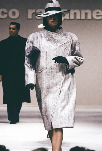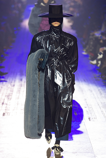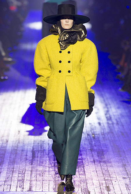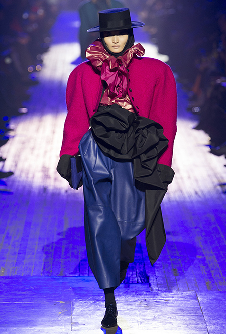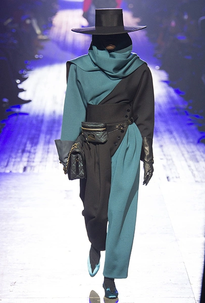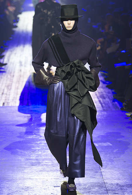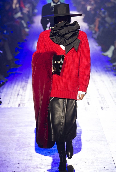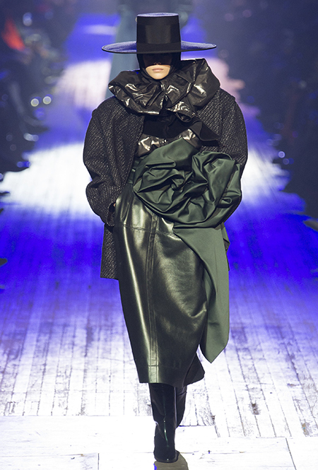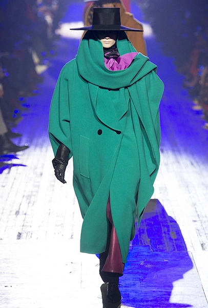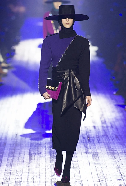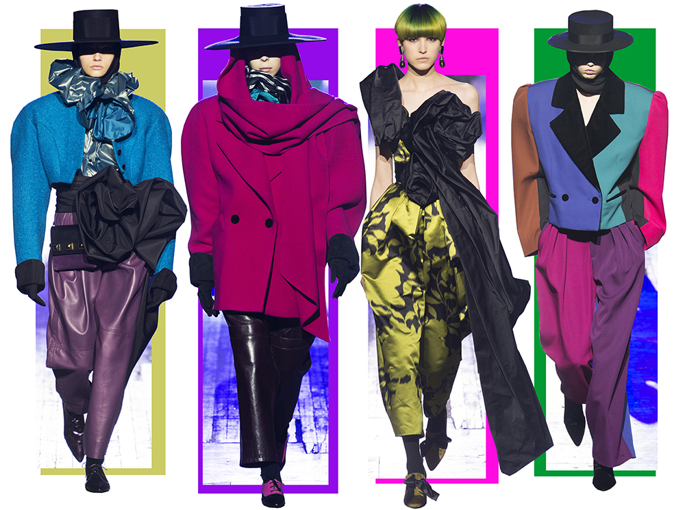 Связующим звеном всей коллекции стали черные, широкополые шляпы, автор которых – модист Стивен Джонс. Аллюзии на них на раз-два отыскались в весенне-летней коллекции 1989 года Ива Сен-Лорана, в показах которого головным уборам всегда отводилась немаленькая роль.