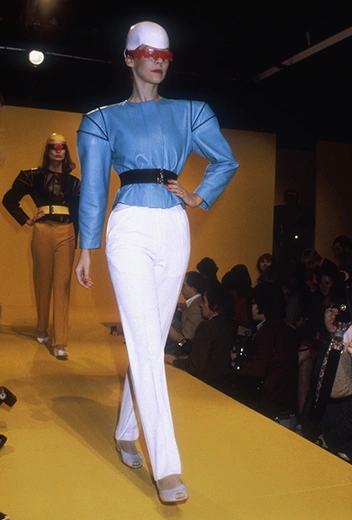 Марк Джейкобс использует в своей работе винил – культовый материл эпохи 80-х годов, разукрашивая его в яркий бирюзовый оттенок. Похожий мы нашли в весенне-летней коллекции 1980 года Пьера Кардена. Кроме того, в своей работе его часто использовал небезызвестный Клод Монтана (и даже с удоволствием носил сам на официальных мероприятиях со строгим, обозначенным дресс-кодом).