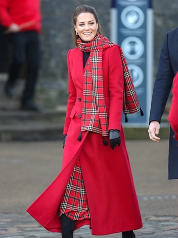 На Кэтрин был ансамбль, полностью отвечающий представлениям о новогодних праздниках: длинное алое пальто Alexander McQueen и комплект из шарфа и юбки одинаковой тартановой расцветки. В том же красном пальто Кейт видели во время нескольких встреч осенью этого года. В юбке Emilia Wickstead герцогиня тоже уже появлялась — на Рождество 2018 года.