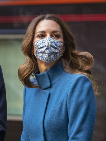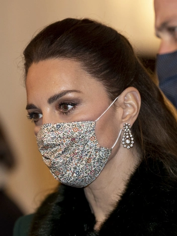 Как и в первый день путешествия, в понедельник герцогиня появилась в маске, сшитой Amaia Kids из ткани Liberty London, но на этот раз с узором в синих тонах, сочетающимся с оттенком пальто. Расцветка ткани носит название в духе начала XIX века — Emma and Georgina. Комплект обручальному кольцу принцессы Дианы составили серьги с сапфирами, окруженными бриллиантами, которые так идут Кейт.