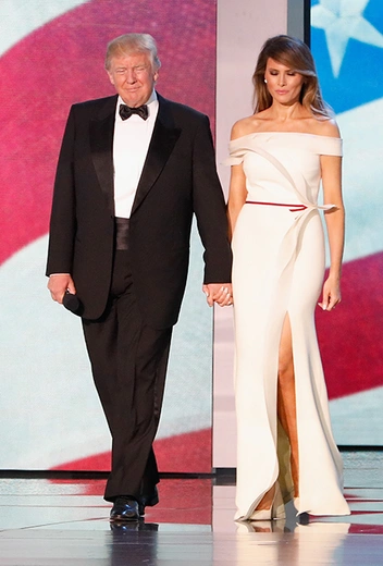 Вечером того же дня, отправляясь на инаугурационный бал, Мелания облачилась в белое платье, сшитое для нее Эрве Пьером — личным стилистом и соратником. Несмотря на крайне сжатые сроки (у Эрве было всего две недели на наряд), получилось очень симпатично: сливочный оттенок и прямой крой, вкупе с открытыми плечами, эффектной драпировкой на груди и высоким разрезом, Мелании Трамп очень идут.
