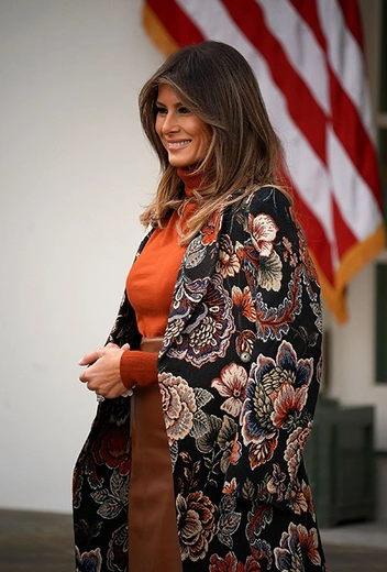 Завершает рейтинг десяти лучших образов первой леди тоже простой, но этого не менее эффектный образ в стиле кэжуал, который Мелания выбрала для Дня благодарения в Белом доме. Интересное сочетание фактур и цветов пальто в набивных цветах от Stella McCartney, рыжей трикотажной водолазки и коричневой кожаной юбки идут Мелании, выгодно оттеняя ее оттенок кожи и цвет волос.