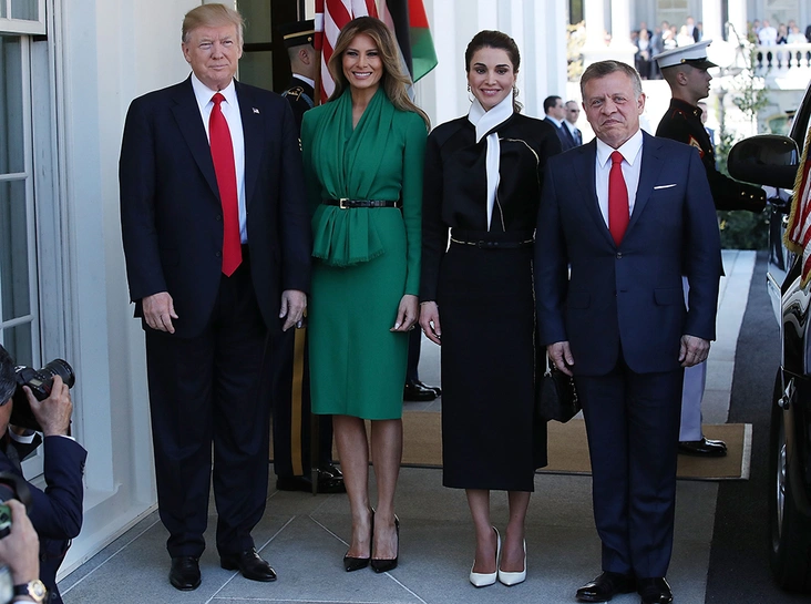 Вообще Эрве Пьер и Мелания Трамп понимают друг друга с полуслова: практически все наряды, которые звездный стилист шьет для своей «первой клиентки», оказываются очень комплиментарными. Поэтому когда в расписании Мелании замаячила встреча с одной из самых стильных монархинь в мире, иорданской королевой Ранией, на помощь была вызвана тяжелая артиллерия в лице Пьера. Не зря: зеленое платье, в котором Трамп встречала высоких гостей с Ближнего Востока, позволило ей одержать убедительную победу в этой модной схватке.