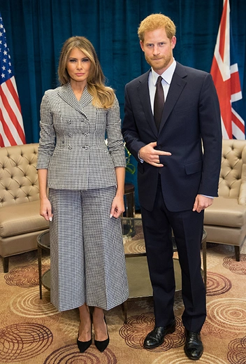 Меж тем, когда стиль à la garçonne получает менее прямолинейную трактовку в гардеробной первой леди, он играет ей на пользу. Отличный пример — серый костюм в гусиную лапку от Dior, который Мелания надела на встречу с принцем Гарри, другим постоянным героем всех таблоидов планеты.