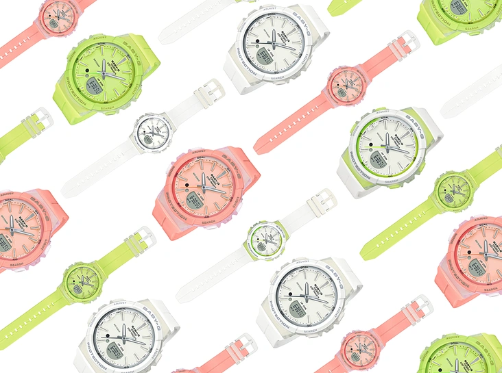 Модель представлена в четырех расцветках: нежно-розовой, лаймовой, белой и белой с лаймовой вставкой. Приобрести BABY-G можно в магазинах CASIO WATCH FACTORY, флагманском G-STORE на «Флаконе», а также в корнере марки в универмаге «Цветной».