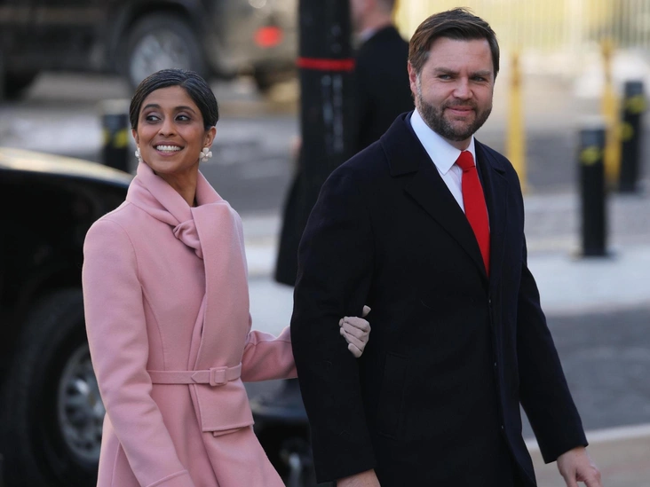 Вторая леди США и супруга вице-президента страны Джей Ди Вэнса подобрала самый мягкий образ и излучала позитивный настрой. На встрече с Камалой Харрис и ее мужем, которая тоже считается частью традиции, Уша блистала в нежно-розовом оттенке, излучающем мягкую силу. Дополнение образа — крупные серьги с четырехлистными цветами, напоминающими символ удачи клевер.