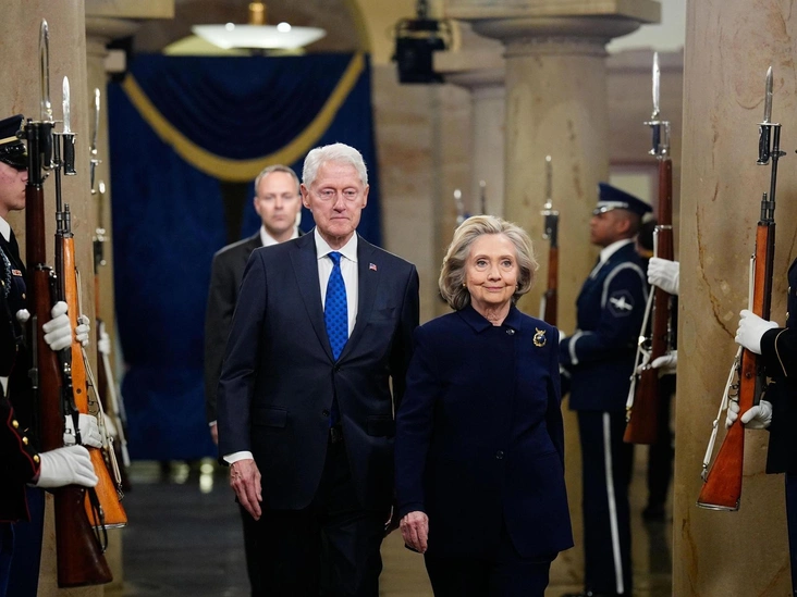 Участие бывших президентов и их жен в свежей инаугурации — тоже традиция, и Хиллари Клинтон не стала ее оспаривать. На мероприятие бывшая соперница Дональда Трампа прибыла в темно-синем костюме из шерсти, который своим цветом намекал на ее партийную принадлежность. Впрочем, если посмотреть на инаугурационный зал, то можно определить, кто из гостей «за» Республиканскую партию, а кто «за» Демократическую, по цвету галстуков и прочих деталей аутфита.