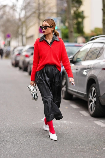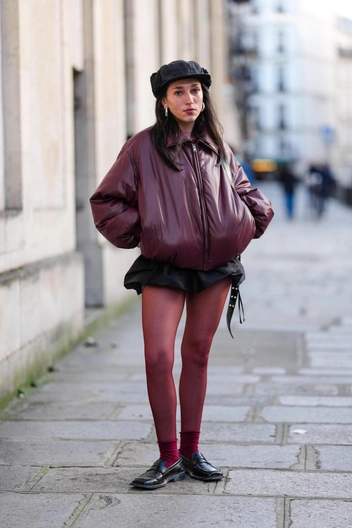 Если говорить о базе в мире колготок, то красные уже встали наравне с черными — настолько часто их носят. Как на стритстайле, так и показах Недель моды, начиная от Blumarine и заканчивая Courreges. Все из-за базовых характеристик красного цвета: он сочетается со многими классическими цветами по типу серого, черного и темно-синего.