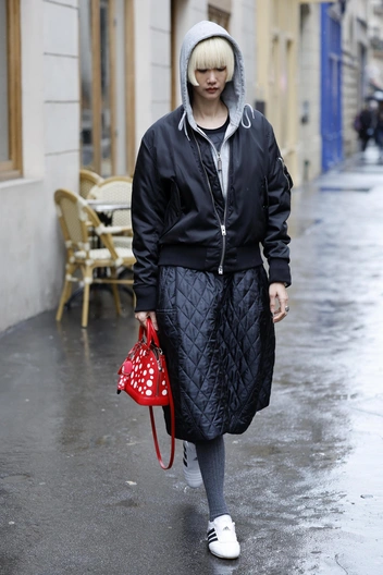 От классических колготок никто не отходит, так что покупаем не только цветные. Речь о серых, темно-синих и черных вариантах, которых по-прежнему много на подиумах. Особенных правил сочетания с такими колготками нет: носим также, как в обычной жизни, с луками на работу и для прогулки.