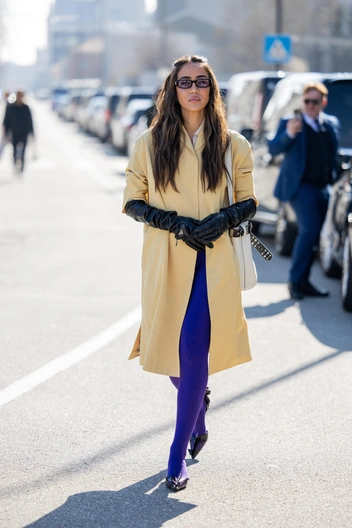 Один из способов сделать образ завершенным — это подобрать два цветовых акцента, которые сочетаются между собой. Раньше в моде был мэтч обуви и сумок, теперь на повестке дня — подбирать перчатки и колготки одного оттенка. Тем более, что цветные перчатки всех цветов радуги — это тренд 2025 года, который стоит взять на заметку.