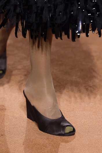 Продолжая о показе Fendi, дизайнеры не зря сделали колготки с акцентным носком — все для того, чтобы привлечь внимание к открытой обуви. Сейчас речь о peep toe: лодочках с открытым носом, которые раньше было принято носить исключительно на голую ногу, либо с телесными чулками. Продолжая тренд, носим цветные колготки и с босоножками, и с сандалиями: этот стайлинг-прием покажет осведомленность в трендах (читайте также: Туфли peep toe снова в тренде: 8 беспроигрышных сочетаний).
