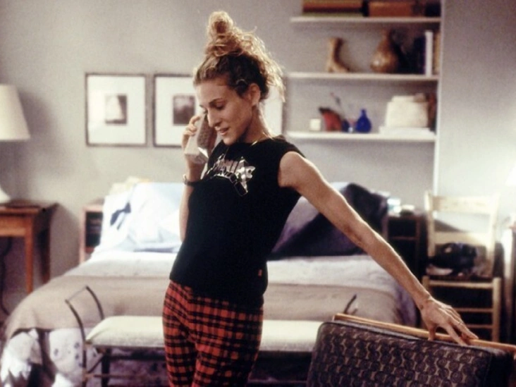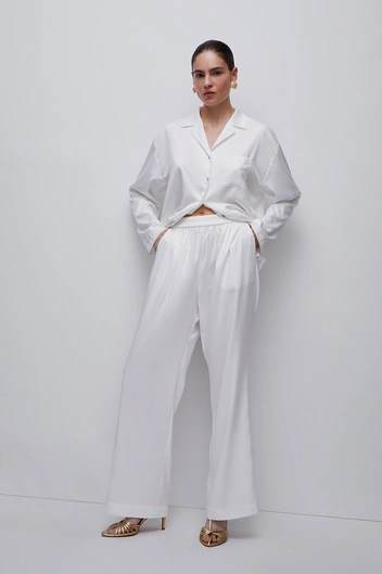 Яркая футболка с принтом и однотонные леггинсы стали самым удобным домашним костюмом, которому сложно составить конкуренцию, ведь он не сковывает движения и смотрится стильно. В последние годы такой аутфит стал популярным и среди модниц: они появлялись на улицах мегаполисов в объемных футболках, худи и лосинах. Как бы нам не нравилась эта стилизация, в новогоднюю ночь она неуместна. Вместо домашнего комплекта выберите атласную блузу или футболку с нарядной деталью и классические брюки, которые можно сочетать с туфлями на каблуке или лоферами.