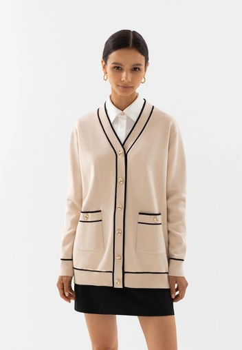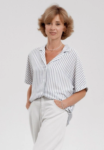 При большом размере груди не рекомендуется носить вещи с горизонтальным принтом, так как он визуально увеличивает зону декольте и добавляет излишний объем. Вместо данного узора работайте с вертикалями: например, это может быть монохромный образ, V-образный неглубокий вырез и полосатый принт. Если составлять многослойный аутфит, тогда наденьте в качестве внутреннего слоя базовую рубашку, а внешнего — удлиненный жакет.