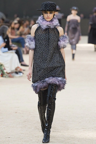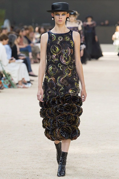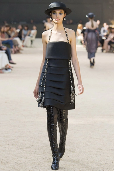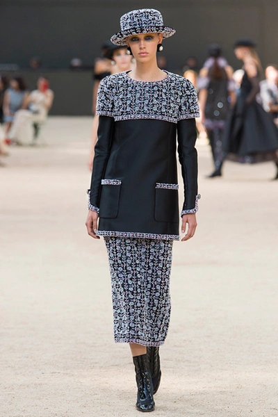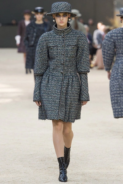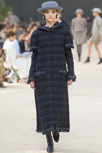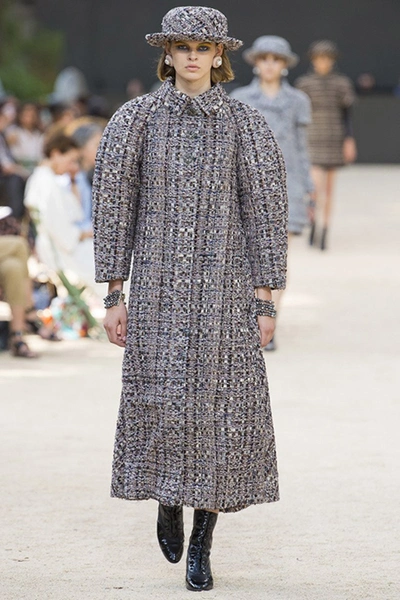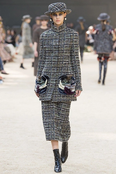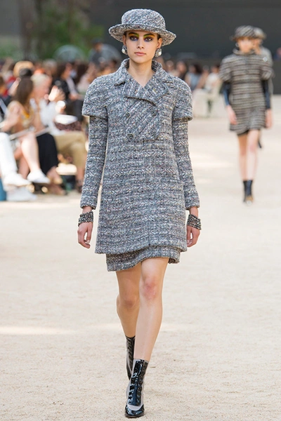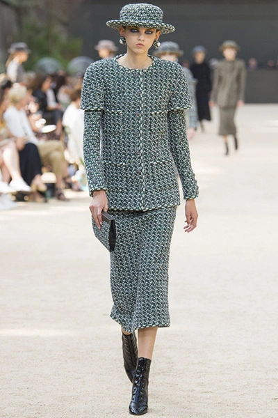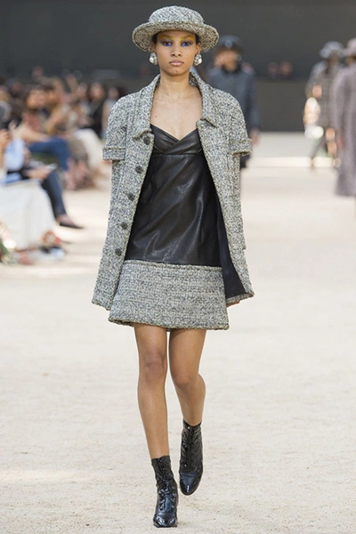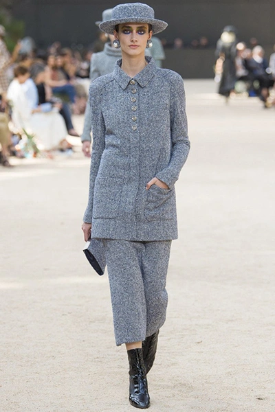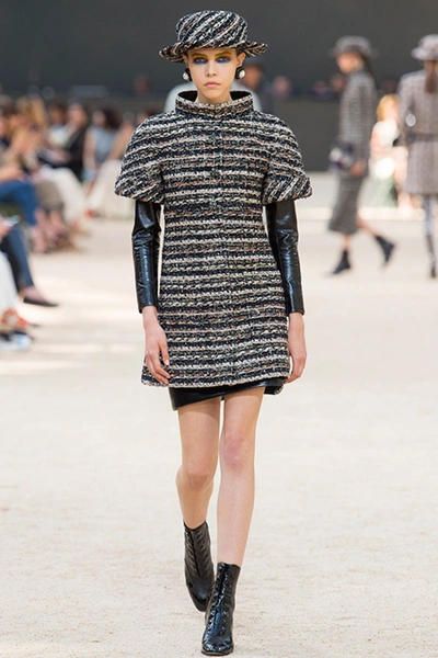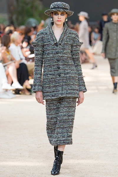 Почти каждый образ был дополнен на показе шляпой-канотье из твида или кожи – головной убор такой формы особенно любила сама Коко Шанель. Они, а также узкие ботильоны на шнуровке с квадратным прозрачным каблуком наверняка станут одним из главных must have грядущего сезона.