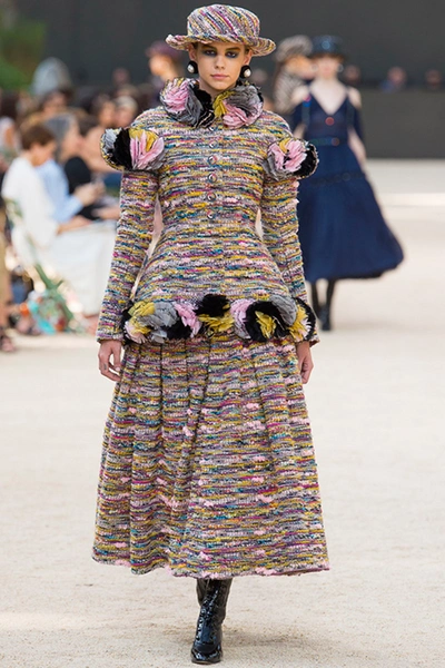В плане цвета коллекция получилась по-шанелевски сдержанной. Хотя сказать, что в ней нет ярких пятен, нельзя. Нашлось место и глубокому синему, и розовому, и фуксии и оттенку охры. На твиде, который, разумеется, стал главной тканью, эти цвета, а особенно их сочетания и переходы из одного в другой, смотрятся особенно выигрышно. Отдельная тема – круги и шары, которые в этом сезоне особенно полюбились Карлу. Кое-где подолы платьев рукава и даже обувь украшены разноцветными искусственными цветами, которые сплетены, словно клубки. А сразу три вещи – два платья и жакет – изрисованы принтами в виде разноцветных кругов, - на их создание Карла вдохновили картины жены Робера Делано Сони.