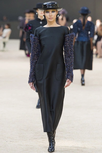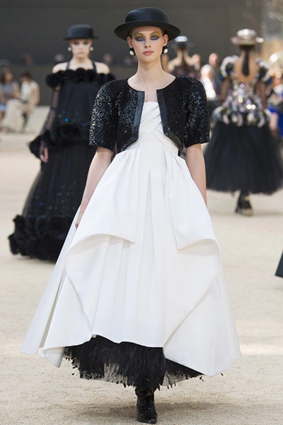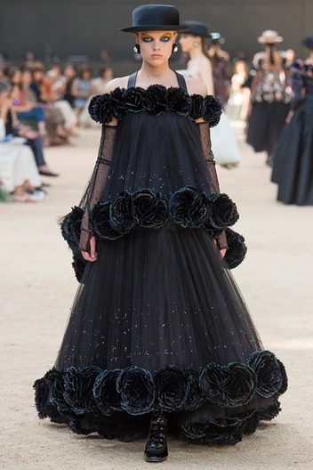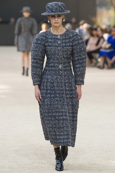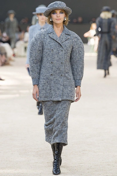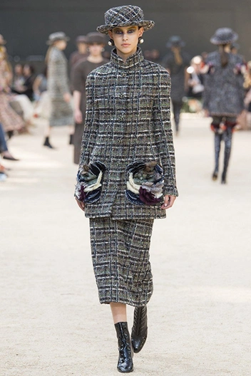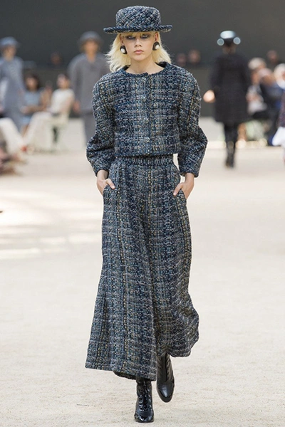 Башня, нарисованная в 1926 году французским художником Робером Делано, была изображена и на приглашениях на шоу. В общем, не сложно догадаться, что в этом сезоне Лагерфельд рисовал эскизы вдохновляясь именно ею – ее простыми, плавными линиями и А-образными очертаниями. Треугольный, расширяющийся к низу силуэт, стал одним из основополагающих. Здесь есть вечерние платья с декольте и широкими юбками – где-то они пышные, за счет чего получается выраженной линия талии, где-то – талии почти нет и очертания выглядят плавными. Иногда к низу расширяются и удлиненные твидовые жакеты – такой силуэт придает строгому образу динамики.