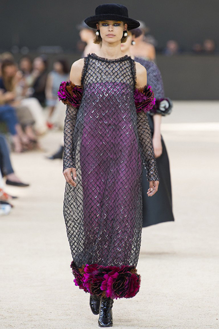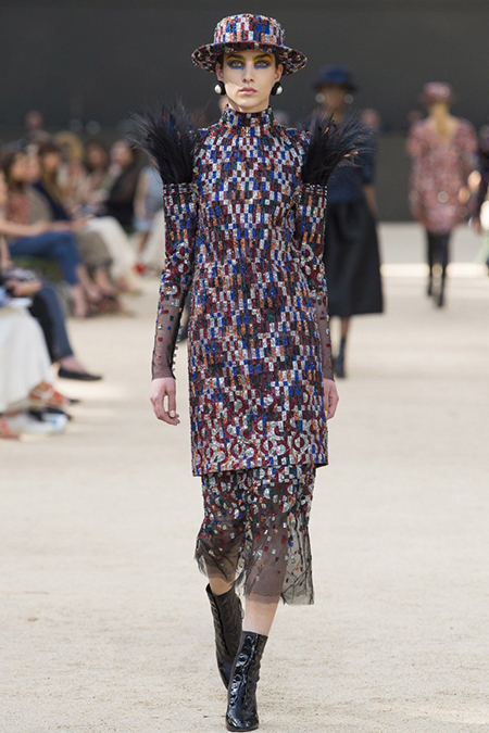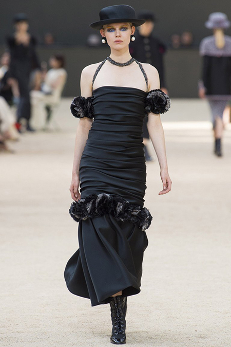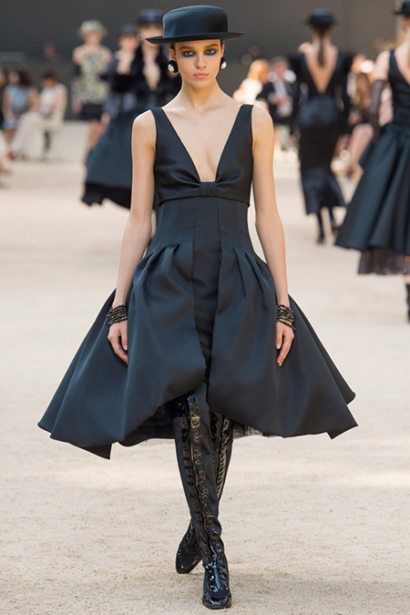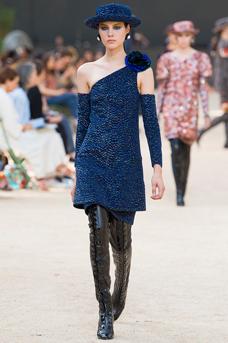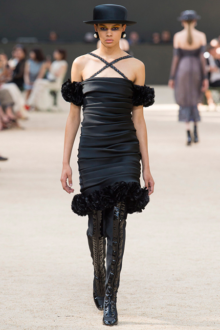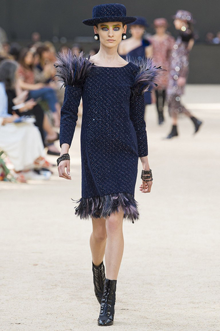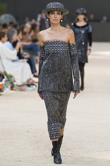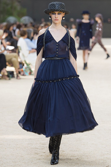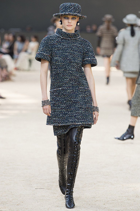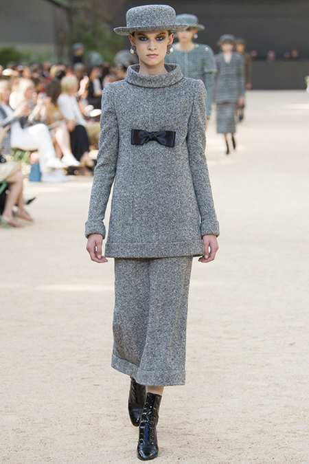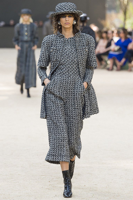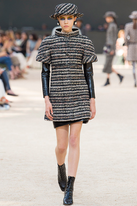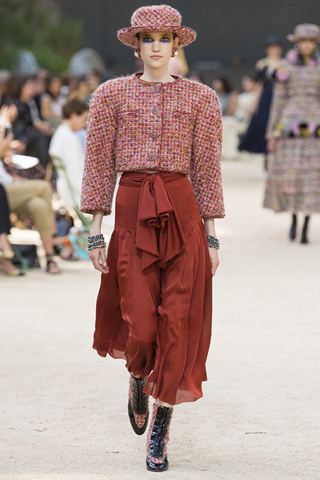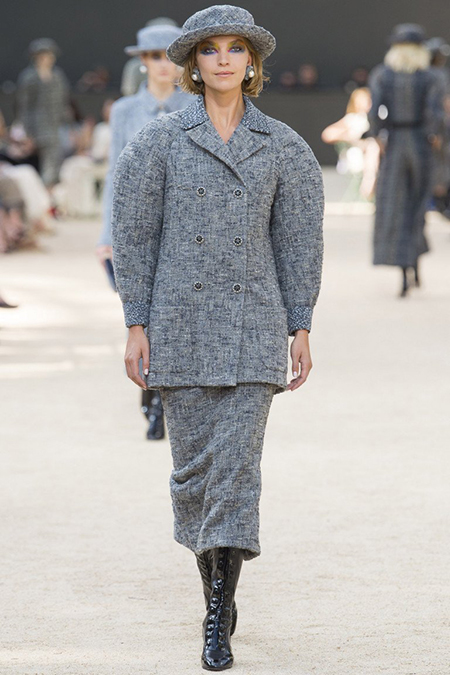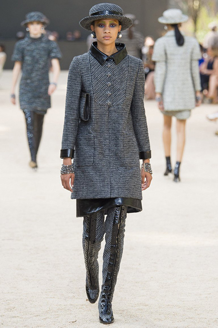 Почти каждый образ был дополнен на показе шляпой-канотье из твида или кожи – головной убор такой формы особенно любила сама Коко Шанель. Они, а также узкие ботильоны на шнуровке с квадратным прозрачным каблуком наверняка станут одним из главных must have грядущего сезона.
