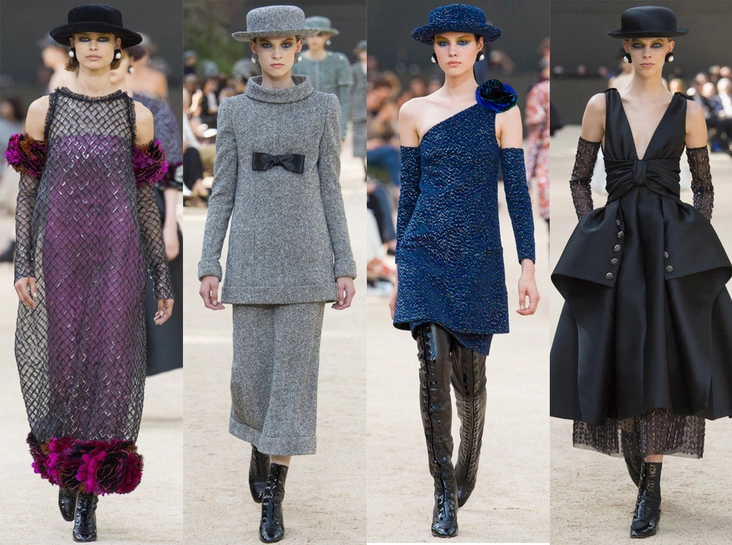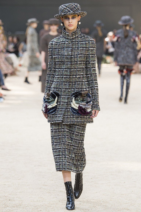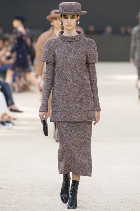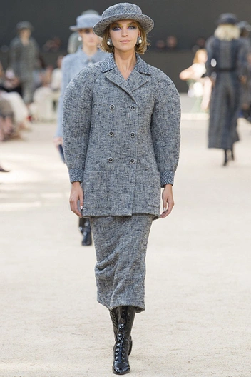 Башня, нарисованная в 1926 году французским художником Робером Делано, была изображена и на приглашениях на шоу. В общем, не сложно догадаться, что в этом сезоне Лагерфельд рисовал эскизы вдохновляясь именно ею – ее простыми, плавными линиями и А-образными очертаниями. Треугольный, расширяющийся к низу силуэт, стал одним из основополагающих. Здесь есть вечерние платья с декольте и широкими юбками – где-то они пышные, за счет чего получается выраженной линия талии, где-то – талии почти нет и очертания выглядят плавными. Иногда к низу расширяются и удлиненные твидовые жакеты – такой силуэт придает строгому образу динамики.