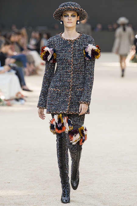В плане цвета коллекция получилась по-шанелевски сдержанной. Хотя сказать, что в ней нет ярких пятен, нельзя. Нашлось место и глубокому синему, и розовому, и фуксии и оттенку охры. На твиде, который, разумеется, стал главной тканью, эти цвета, а особенно их сочетания и переходы из одного в другой, смотрятся особенно выигрышно. Отдельная тема – круги и шары, которые в этом сезоне особенно полюбились Карлу. Кое-где подолы платьев рукава и даже обувь украшены разноцветными искусственными цветами, которые сплетены, словно клубки. А сразу три вещи – два платья и жакет – изрисованы принтами в виде разноцветных кругов, - на их создание Карла вдохновили картины жены Робера Делано Сони.