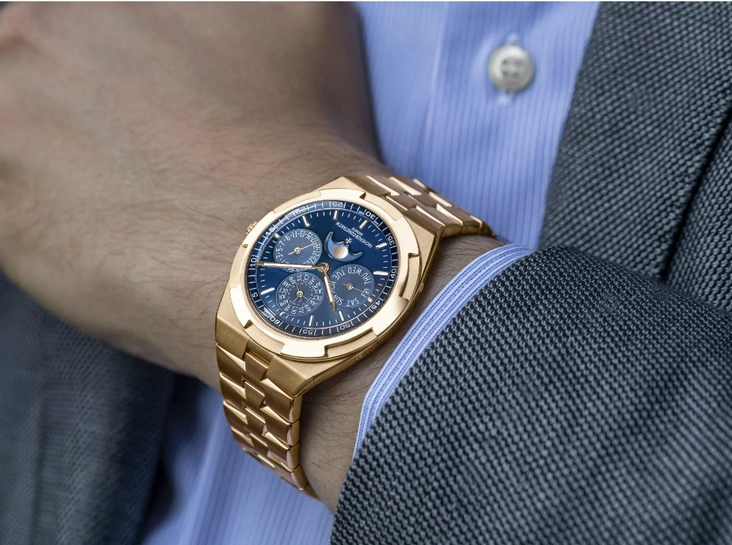 Золотой циферблат с синим лаковым покрытием притягивает взгляд сатинированным узором «солнечные лучи», счетчики выделяются узором в виде концентрических кругов, а заключенная в рамки золотого круга минутная шкала привлекает внимание отделкой с эффектом бархатистой поверхности— розовое золото и лаковый синий создают идеальную пару, ассоциирующуюся со стилем «небрежный шик».