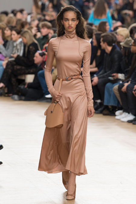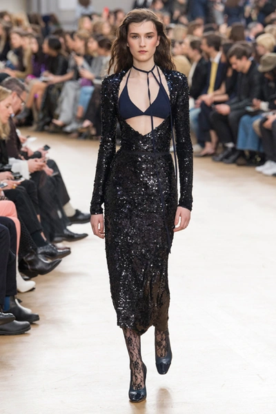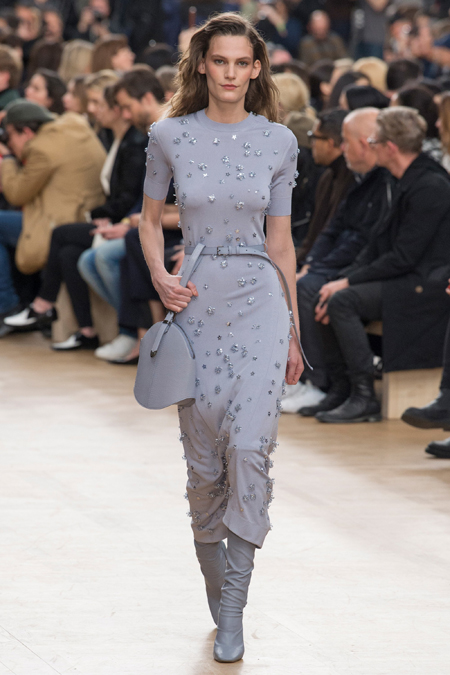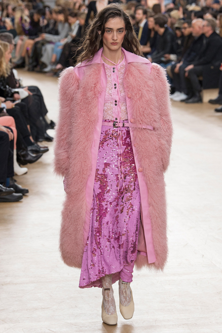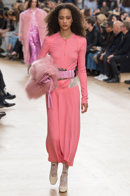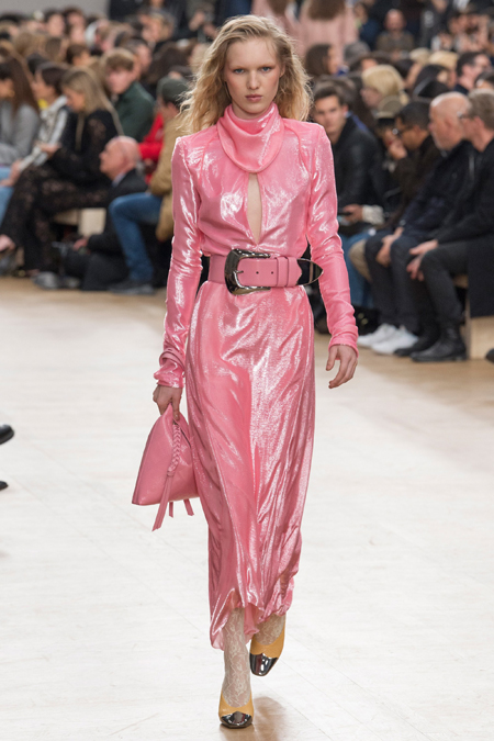 Бережно Гийом обошелся и с 80-ми. Кое-где мелькает Х-силуэт с расширенной линией плеч. Кроме того, дизайнер добавил блеска и яркости, но не слишком – так, чтобы коллекция не переставала производить впечатление сдержанной. Блестящими на этот раз стали длинные розовые юбки в пайетках, розовые же наряды из ткани, напоминающей люрекс, и длинные облегающие черные платья с глубокими вырезами. Носить их Гийом предлагает с бра, которые полностью видны.