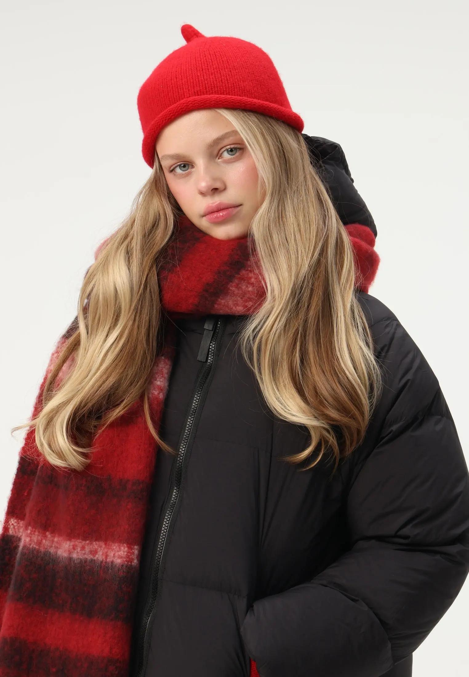 К классическому шерстяному пальто хорошо подходят лаконичные бини без крупных логотипов, береты и аккуратные капоры в насыщенных, но дорогих оттенках. В этой паре важно не переборщить с объемом: чем элегантнее силуэт верхней одежды, тем аккуратнее должна быть шапка. Если пальто светлое, яркий контрастный цвет у лица сделает образ более графичным; если темное — можно добавить теплый оттенок, чтобы смягчить строгость.