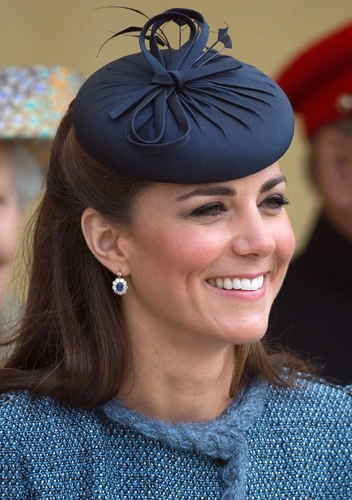 Эти серьги с сапфирами и бриллиантами на обеих монарших особах мы лицезрели не раз. Украшение является подарком наследного принца Саудовской Аравии. В оригинальном варианте серьги имеют в комплекте подвески (с теми же драгоценными камнями), однако герцогиня Кембриджская предпочитает обходиться без них.