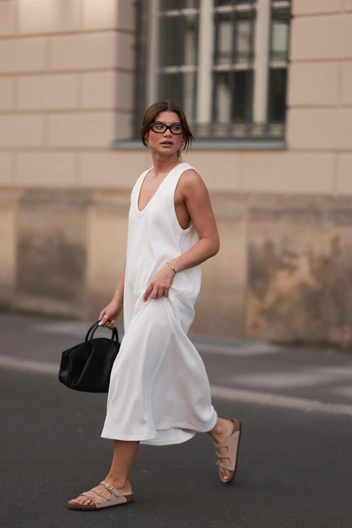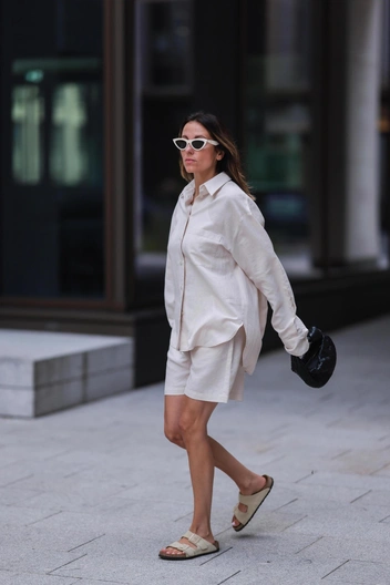 Мы сказали про офисный стиль, но плотной костюмной ткани все же лучше избегать — слишком утяжеляет образ. А вот льняные костюмы с шортами или брюками будут идеальны на лето. К этому же списку относятся джинсовые бермуды или сами джинсы в одном из модных фасонов — например, буткат. А вот слишком женственных вещей лучше избегать — ведь даже по названию сандалий понятно: на свидания в них не ходят.