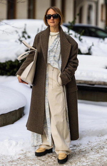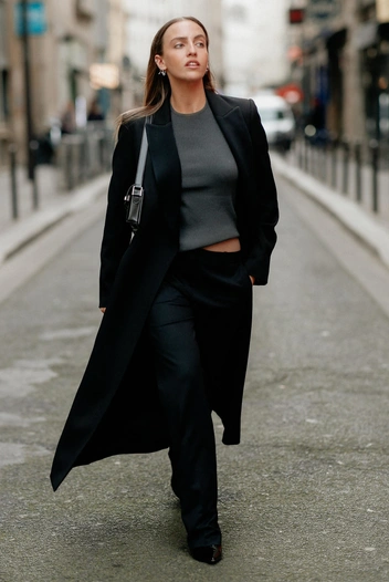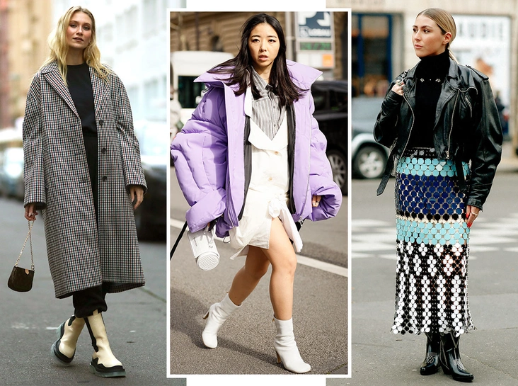 Пальто-халат — один из важнейших пунктов в списке базового гардероба. Девушки обожают этот предмет гардероба и регулярно к нему возвращаются с наступлением холодов. Пальто на запах идеально вписывается в женственные образы, отлично сочетается с платьями и юбками. Самой подходящей обувью с такими аутфитами окажутся сапоги на каблуке и ботильоны. Это могут быть классические модели с острым мысом, трендовые с квадратным и фигурным каблуком, а также обувь в стиле вестерн (читайте также: Полный гид по самой модной обуви на осень и зиму 2022/23).