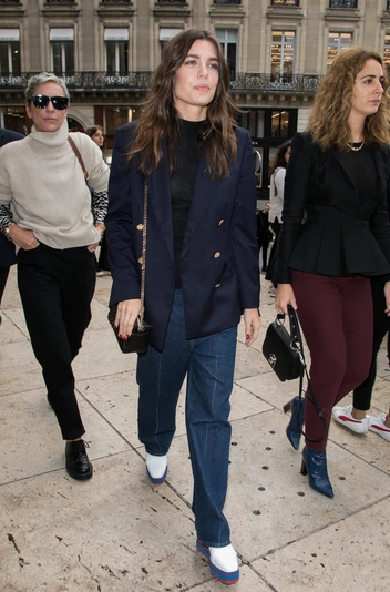 Несмотря на то, что внучка Грейс Келли редко следует протоколу — это ей просто-напросто не нужно из-за удаленности от монакского престола — в джинсах она появляется не так часто, зато каждый образ выглядит интересно. Во время появления на неделе моды в Париже она решила примерить свободные джинсы в стиле 90-х с объемным пиджаком в морском стиле, а годом ранее Шарлотта носила модель Mom с кожаным бомбером с цветочной вышивкой (читайте также: Стиль принцессы Каролины: модные правила старшей дочери Грейс Келли).