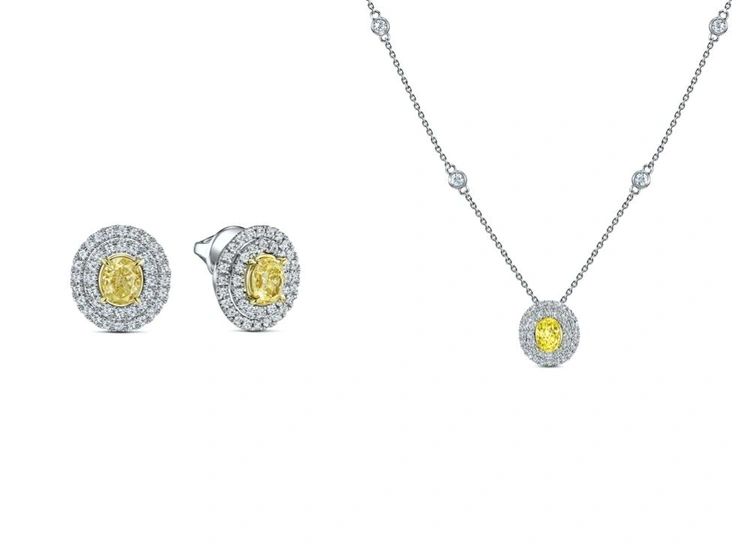 Комплект из удивительных колье и серег наглядно показывает первое и заметное отличие желтого камня от бесцветных бриллиантов. Вторые минералы мы чаще привыкли видеть в огранке «круг», которая считается наиболее популярной, желтые же драгоценные камни более выигрышно смотрятся в огранке «овал». И, приглядевшись, мы можем понять причину такого ювелирного предпочтения.